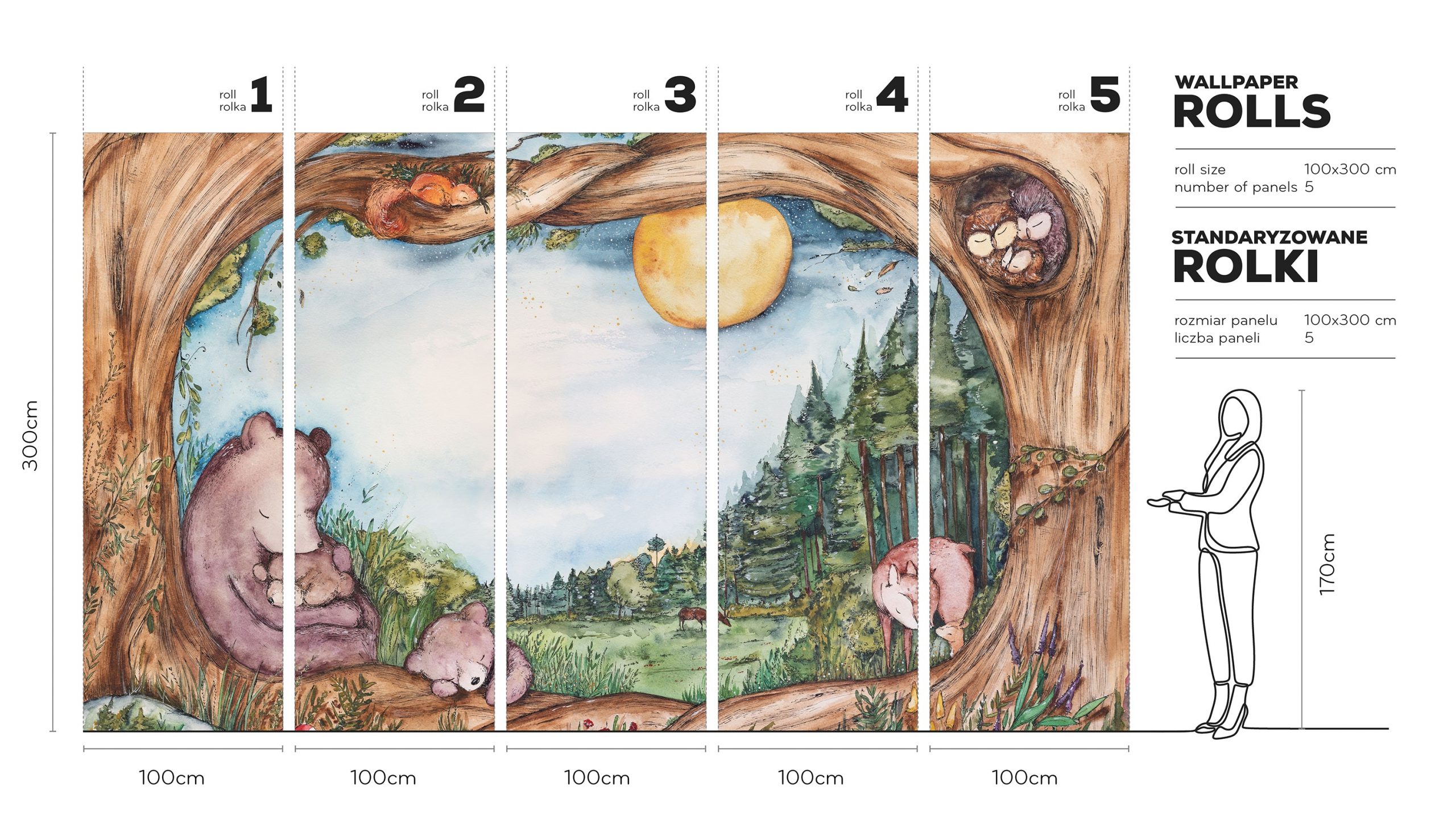 „Bears Family – Tapeta w standaryzowanych rolkach” została zaprojektowana z myślą o łatwym montażu. Scena podzielona jest na czytelne, standaryzowane pasy, co ułatwia precyzyjne spasowanie kompozycji i dyskretne łączenia. To starannie dopracowany, wyjątkowo szczegółowy mural, który nadaje wnętrzu miękkość, głębię i ciepło – jak kołysanka namalowana na ścianie. Jeśli marzysz o pokoju, który otula, zaproś do niego nocny las i przyjazną niedźwiedzią rodzinę.