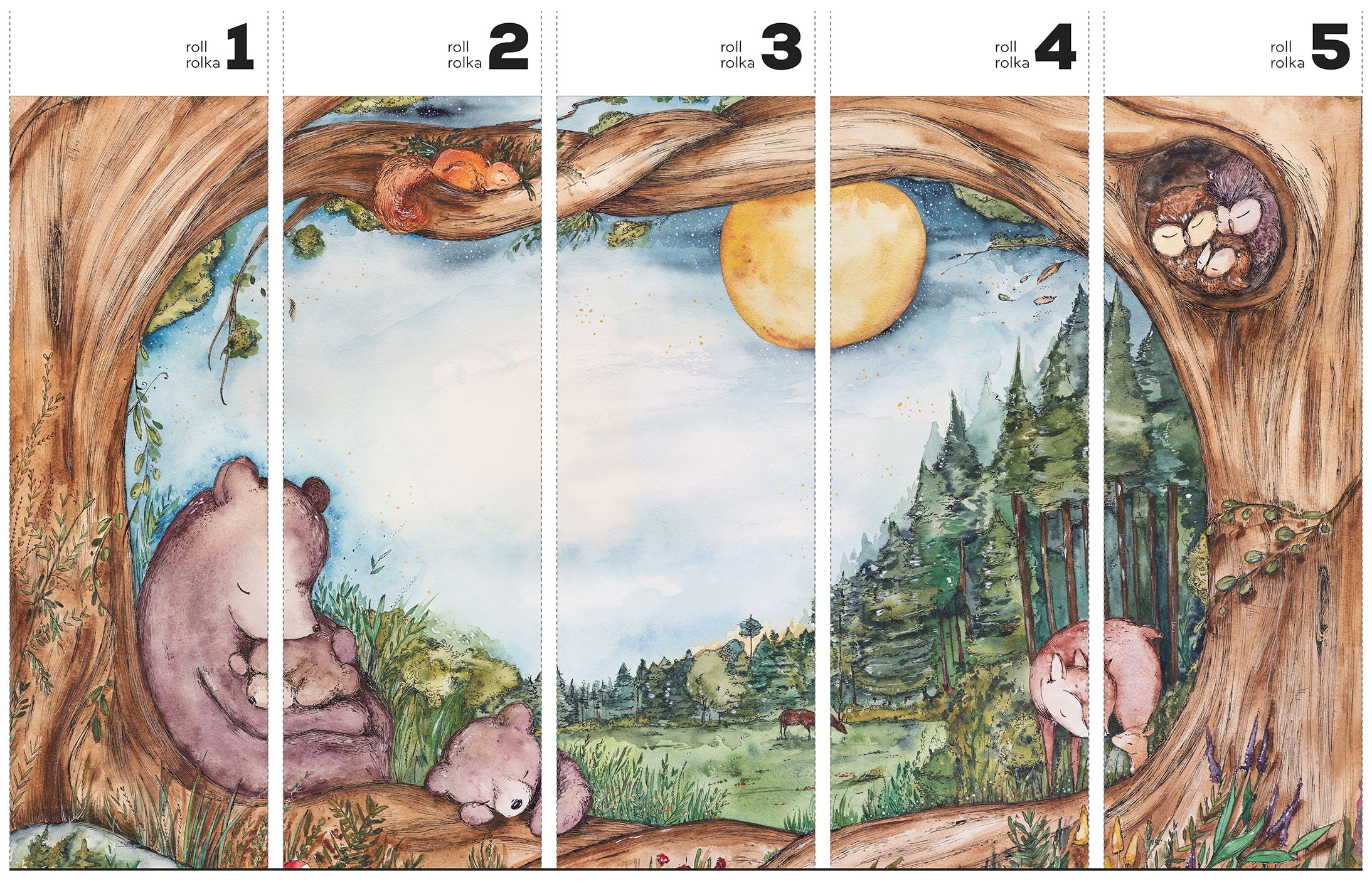 Zgaś światło, a w pokoju rozbłyśnie piękne, nocne niebo. Pełne gwieździstych punkcików i blasku księżyca. „Bears Family – Tapeta w standaryzowanych rolkach” przenosi na ścianę wzruszającą akwarelową historię. Pod rozłożystym drzewem duży niedźwiedź tuli malucha, a nad nimi spokojnie śpi wiewiórka. Horyzont rysuje miękka linia leśnych koron. To nie powtarzalny deseń, lecz wyjątkowy mural, którego kompozycja płynnie rozciąga się na całej ścianie, tworząc spójny, narracyjny kadr.