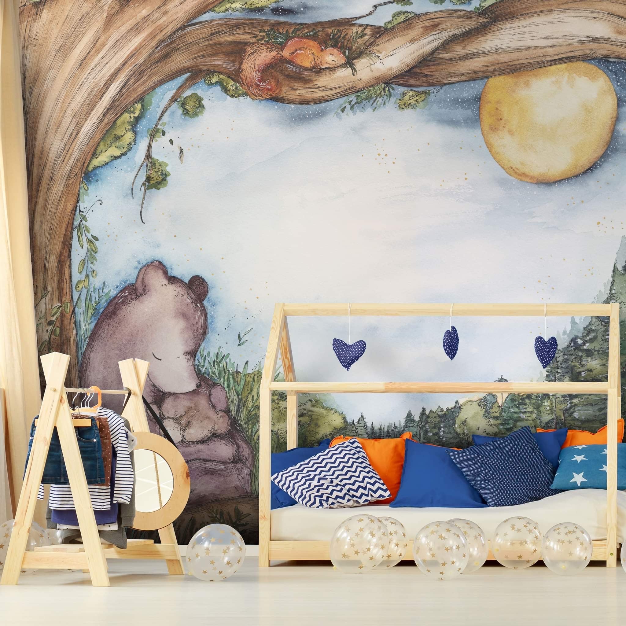 Z perspektywy użytkownika, największą wartością jest atmosfera. Spokój, bezpieczeństwo i marzycielska aura wspierają wyciszenie i rytuał zasypiania. Mural staje się centralnym punktem pokoju dziecka i inspiruje do opowiadania historii. Dzięki neutralnej, naturalnej palecie harmonijnie łączy się z drewnianymi meblami, tekstyliami w zgaszonych odcieniach oraz stylem nursery-chic, skandynawskim czy boho. Świetnie sprawdzi się w sypialni malucha, kąciku do czytania lub w żłobku, przedszkolu i rodzinnym gabinecie.