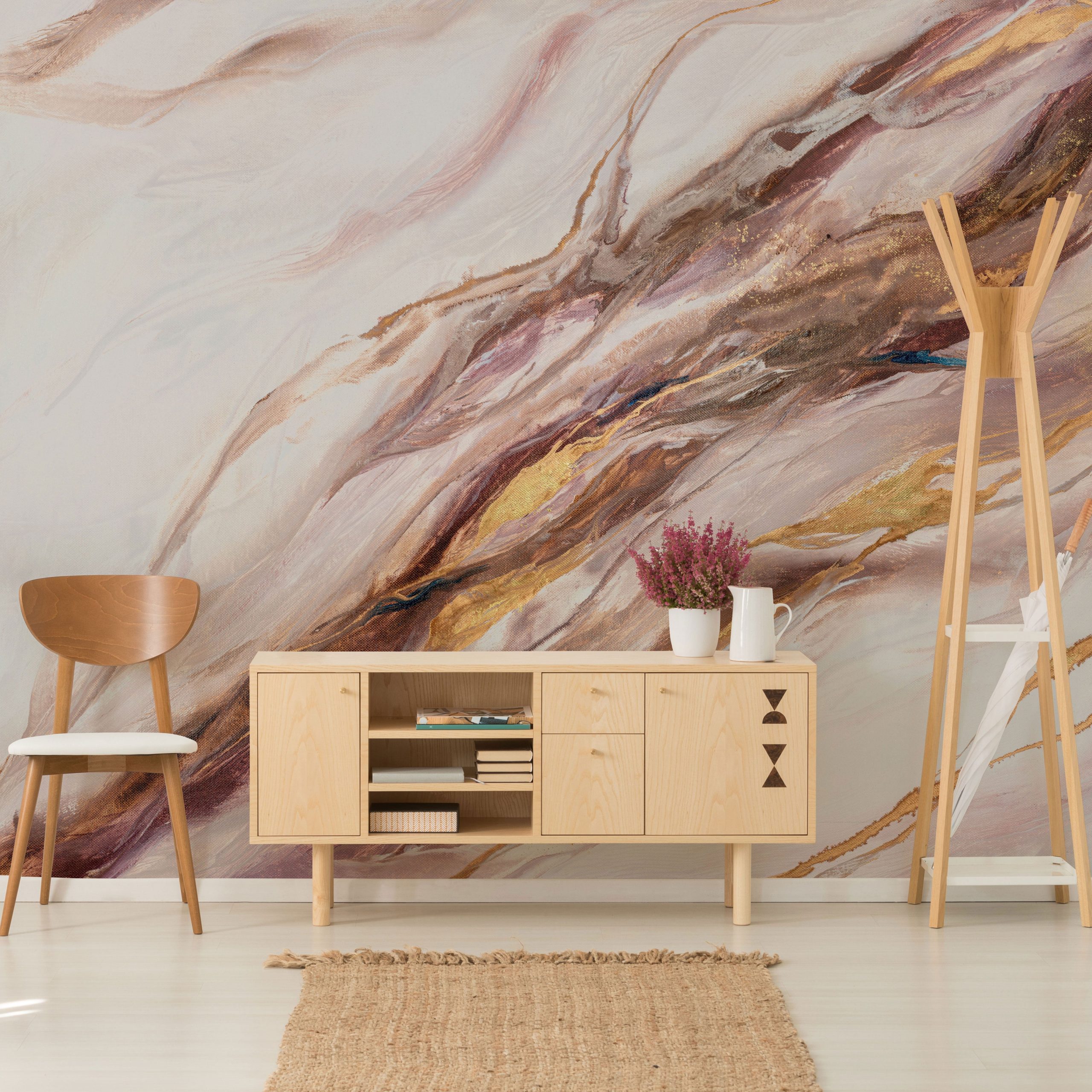 Wyobraź sobie ścianę, która nie tylko ozdabia, ale prowadzi wzrok jak płynne malowidło. Jej kolory zaczynają się od kremowo-białej bazy, przechodzą przez beże i ciepłe brązy, aż do przygaszonego różu z nutą fuksji. Całość jest muśnięta subtelnym turkusem i rozświetlona lśniącym złotem. Blaze – tapeta w standaryzowanych rolkach zamienia Twoje wnętrze w nowoczesną kompozycję typu fluid art. Dzięki organicznym przejściom i marmurowym żyłkowaniom, uzyskujesz efekt spokojnej, a zarazem intrygującej głębi.
