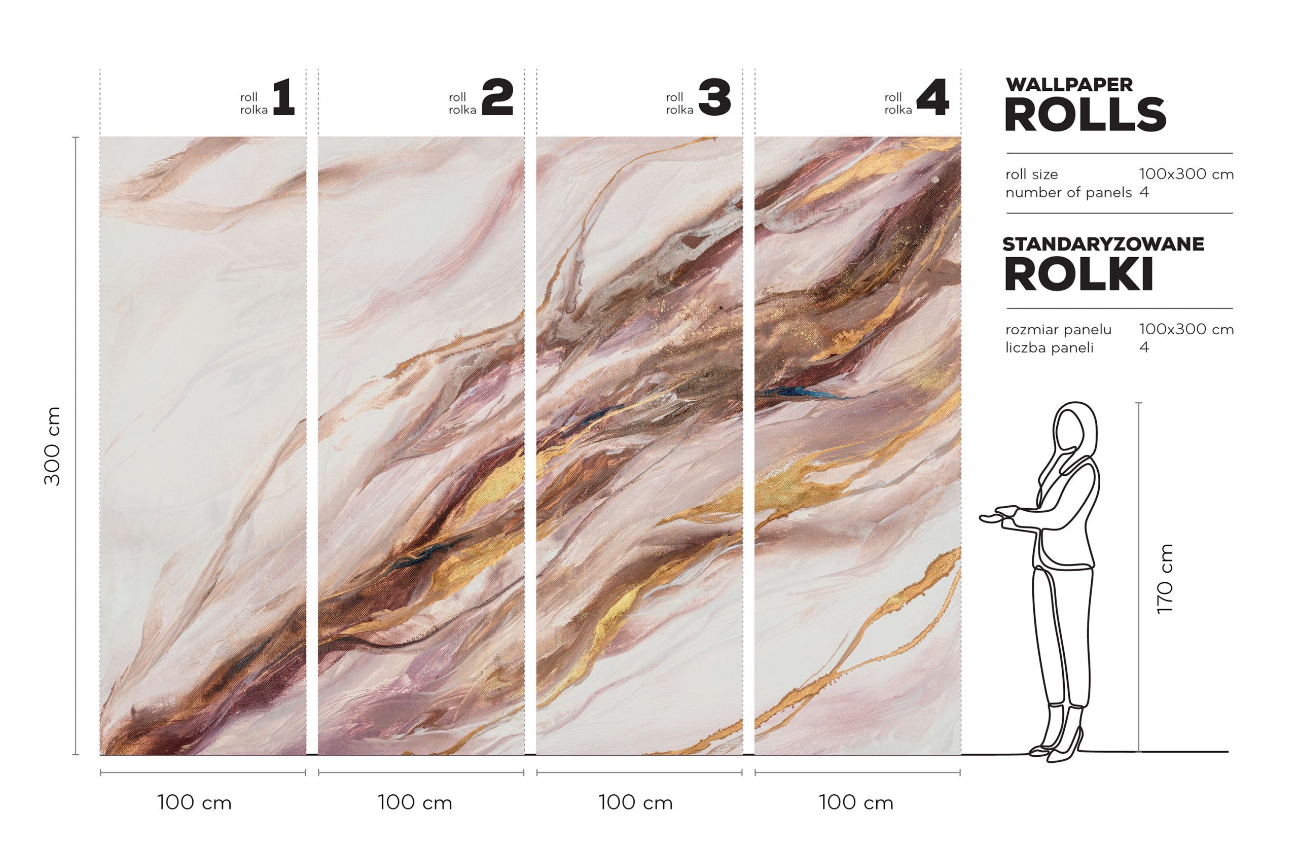 To projekt o artystycznym charakterze, inspirowany obrazami malowanymi olejem i akrylem. Wysokiej jakości druk wiernie odwzorowuje delikatne gradacje kolorów i precyzyjne smugi, tworząc przytulną atmosferę. Złote akcenty wprowadzają do wnętrza szlachetny blask. Wzór sprawia wrażenie dużego, niemal muralowego dzieła, dzięki czemu ściana wygląda jak jedność, a to wszystko przy wygodzie montażu w rolkach.