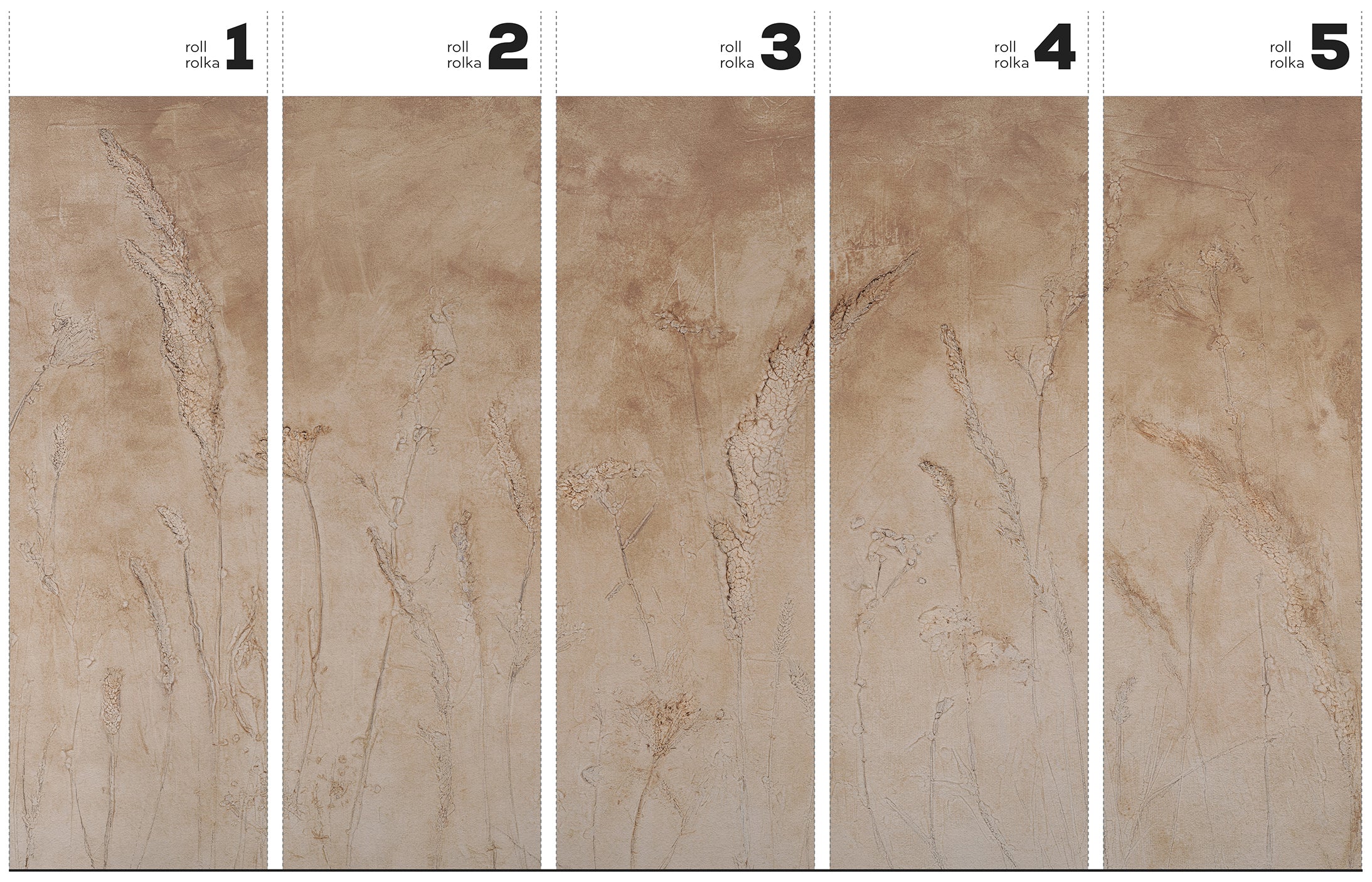 Wyobraź sobie ścianę, która oddycha ciepłem ziemi. Tapeta Campo di Grano, dostępna w praktycznych rolkach, przekształca przestrzeń w spokojną, organiczną scenerię. Wydaje się, jakby była delikatnie przetarta czasem. W jej palecie znajdują się terakoty, beżowo-brązowe odcienie oraz przygaszony różowy brąz. Dodatkowo, piaskowe akcenty i rdzawe pogłębienia tworzą efekt miękkiego cieniowania i harmonijnej, niemal monochromatycznej kompozycji. Subtelne zarysy suszonych traw i ziół wyłaniają się z tła, które przypomina stiuk z mikrospękaniami. To doskonała synteza naturalistycznej botaniki i organicznej abstrakcji.