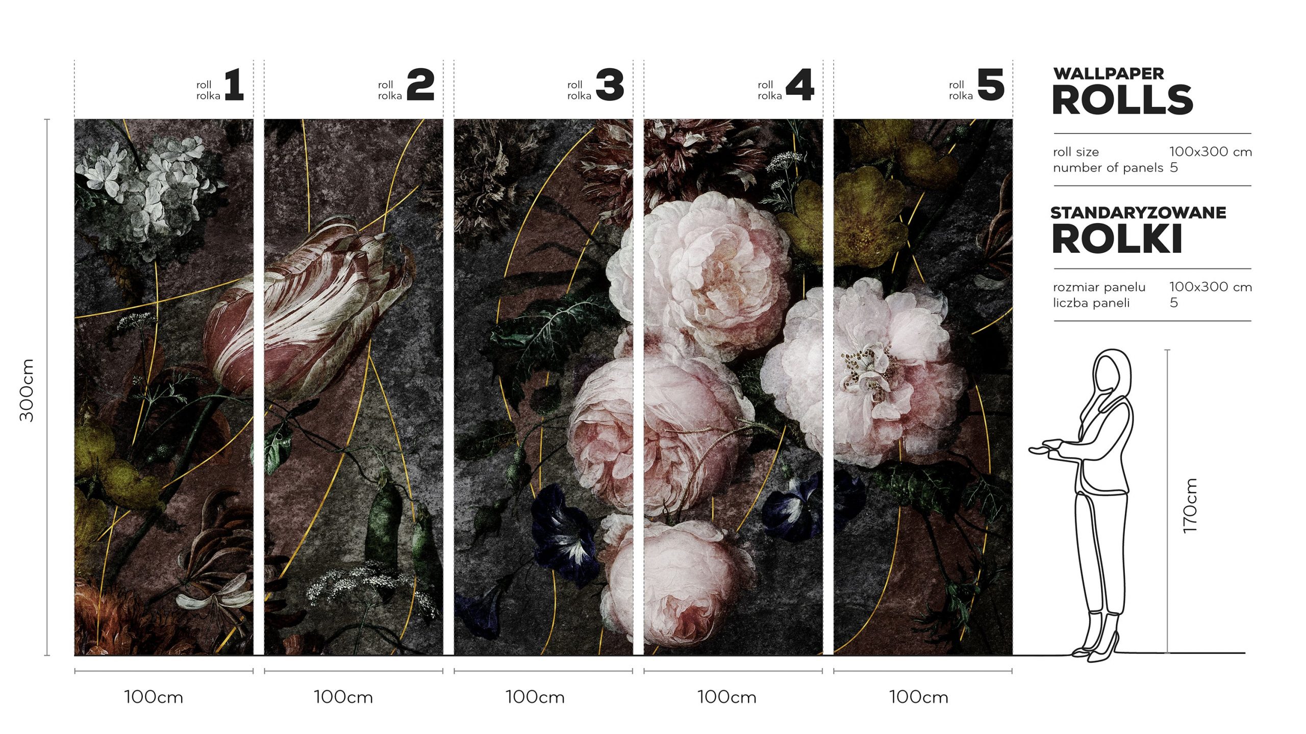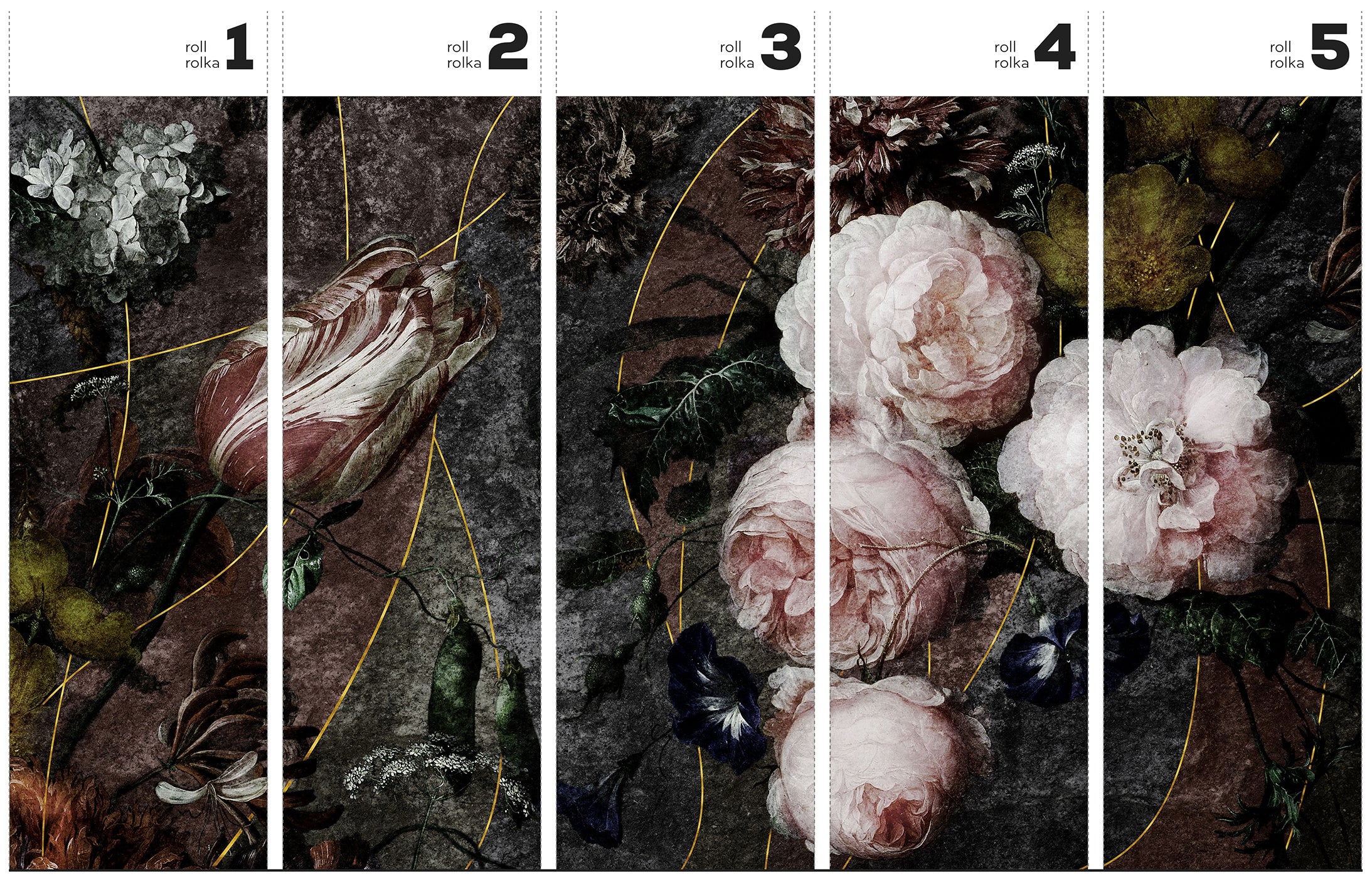 To nie tylko tapeta, lecz swoisty mural – dramatyczny i elegancki, przypominający nowoczesną interpretację holenderskiej martwej natury. Charme Requiem tworzy monumentalny obraz. W salonie lub jadalni stanie się centralnym punktem, w sypialni doda nastroju, a w foyer, butiku lub lobby podniesie prestiż i podkreśli charakter marki. Idealnie wpisuje się w aranżacje w stylu modern classic, glamour, art déco, dark academia oraz eklektycznym.