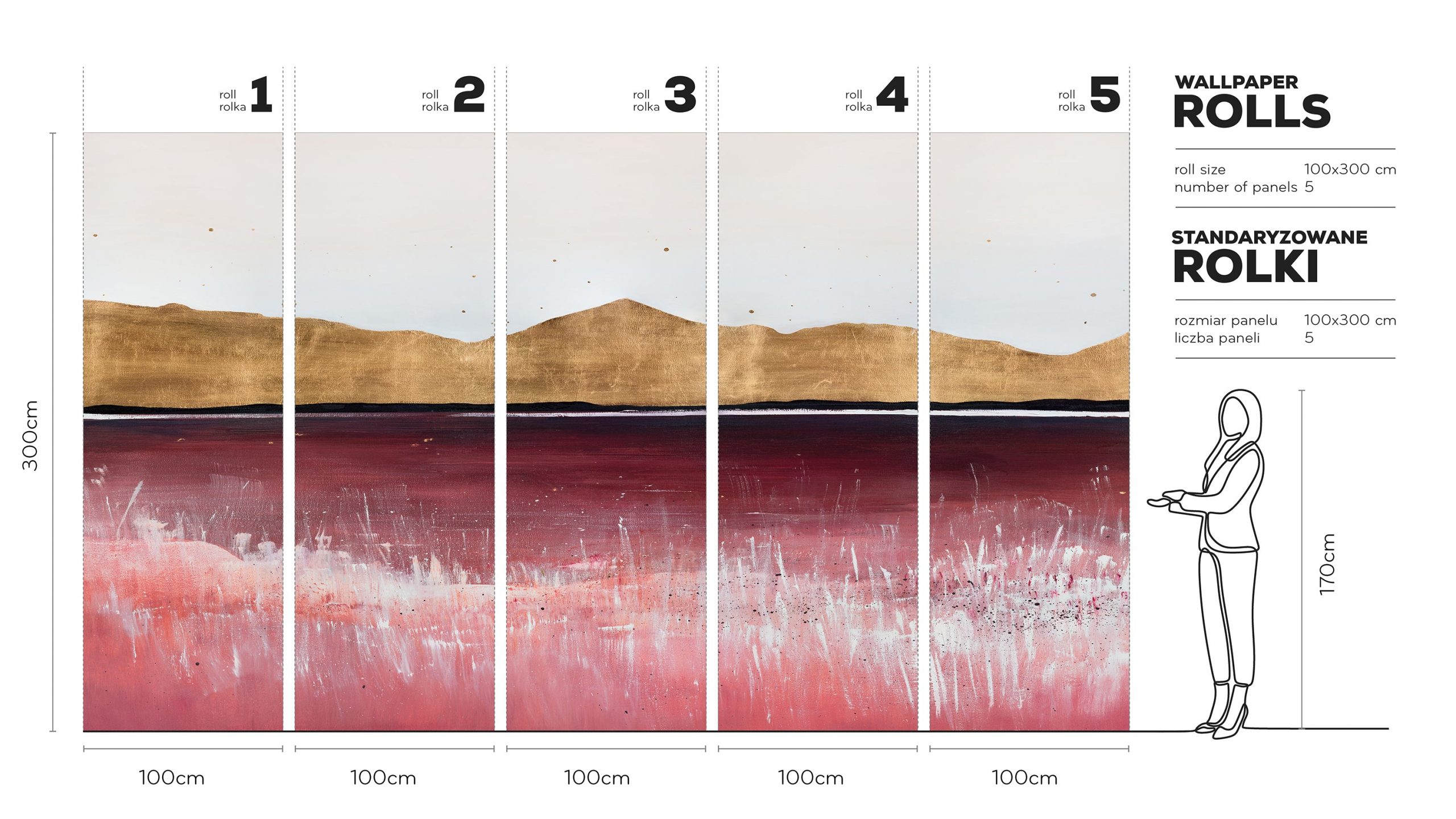 Wyobraź sobie złote słońce, delikatnie zawieszone nad horyzontem. Jego blask rozlewa się po fali burgundowych i czarnych tonów. Tapeta Costa – dostępna w standaryzowanych rolkach – przenosi na ścianę ekspresyjny, abstrakcyjny pejzaż. To dzieło sztuki ma galeryjny charakter i czerpie inspiracje z obrazu „Horyzonty Słońca” Joanny Osińskiej, będącego częścią kolekcji Arte. Ten niepowtarzalny wzór tworzy spójny mural. Złociste pasma przypominają górskie grzbiety, a wyraźna linia horyzontu oraz głębokie przejścia karmazynu w czerń z subtelnymi, białymi akcentami sprawiają, że projekt zachwyca.