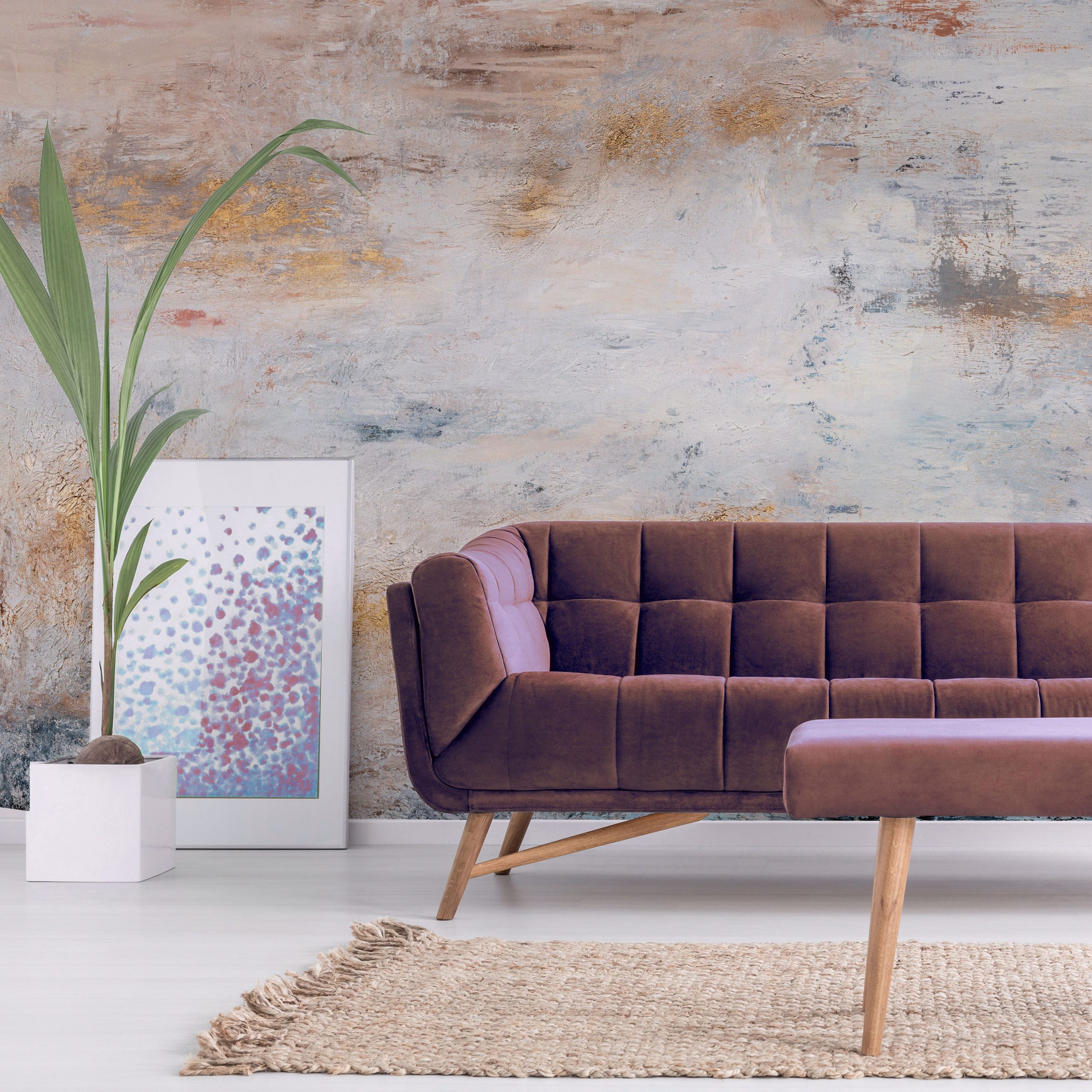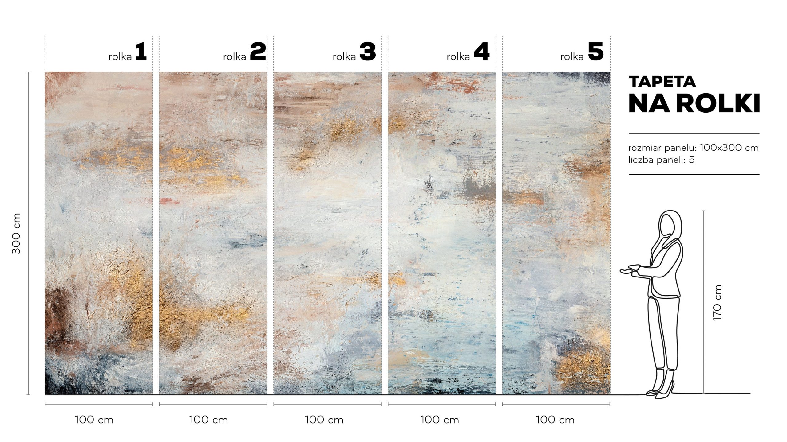 Ten wzór nie tylko koi, ale też intryguje. Ciepła paleta kolorów wprowadza harmonię i wyrafinowanie, natomiast rdzawobrązowe i grafitowe smugi dodają charakteru, pasując do industrialnego lofteru czy galerii sztuki. Wysoka jakość druku oddaje niuanse pękającej farby i nieregularności tła. Dzięki temu ściana wygląda jak niepowtarzalny mural, a nie jak standardowa tapeta. Złote akcenty subtelnie ożywiają całość, podkreślając luksusowe wrażenie.