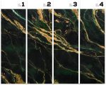 Ten wzór charakteryzuje się wyjątkową dynamiką i spójnością. Ciemne, aksamitne tło dodaje głębi i wycisza przestrzeń, podczas gdy złote akcenty wprowadzają subtelny dramatyzm oraz blask. Metodyczny, wysokorozdzielczy druk dba o tonalne przejścia, co oddaje iluzję mineralnej struktury. Obejmuje zarówno miękkie smugi, jak i wyraźne żyłkowanie, co sprawia, że każdy detal pozostaje jasny i elegancki. Efekt końcowy to wyrafinowane, matowe odczucie powierzchni oraz głębokie kolory, które harmonizują ze światłem w ciągu dnia.