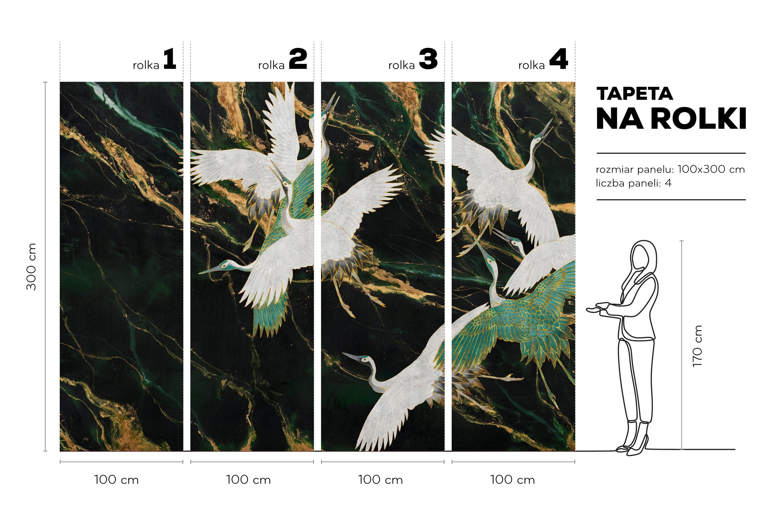 Wyobraź sobie ścianę, która jednym gestem wnosi luksus i spokój do Twojego wnętrza. Emerald Tsuru to tapeta w standaryzowanych rolkach, przedstawiająca żurawie w locie na tle głębokiej, szmaragdowej zieleni. Dopełniają ją grafitowe przejścia oraz złocisto-miedziane akcenty. Paleta barw przypomina malachit i zielony marmur, a białe pióra z delikatnymi szarościami i turkusem tworzą wyrafinowany, orientalny kontrast.