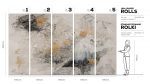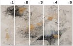 Paleta barw łączy chłodne i ciepłe odcienie szarości z kremową bazą oraz akcentami czerni. Nieregularne, złote przetarcia wprowadzają elegancki, metaliczny połysk. Inspiracje znajdziemy w abstrakcyjnym ekspresjonizmie oraz fluid art, a momentami tapeta przypomina naturalne żyłkowanie marmuru. Rytm plam i miękkie przejścia tonalne tworzą iluzję głębi bez wyraźnych spoin. Dzięki temu łączenia stają się mniej zauważalne, a ściana wygląda jak duże, ręcznie malowane płótno.