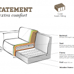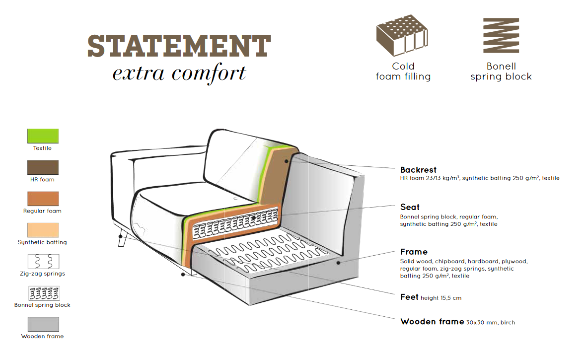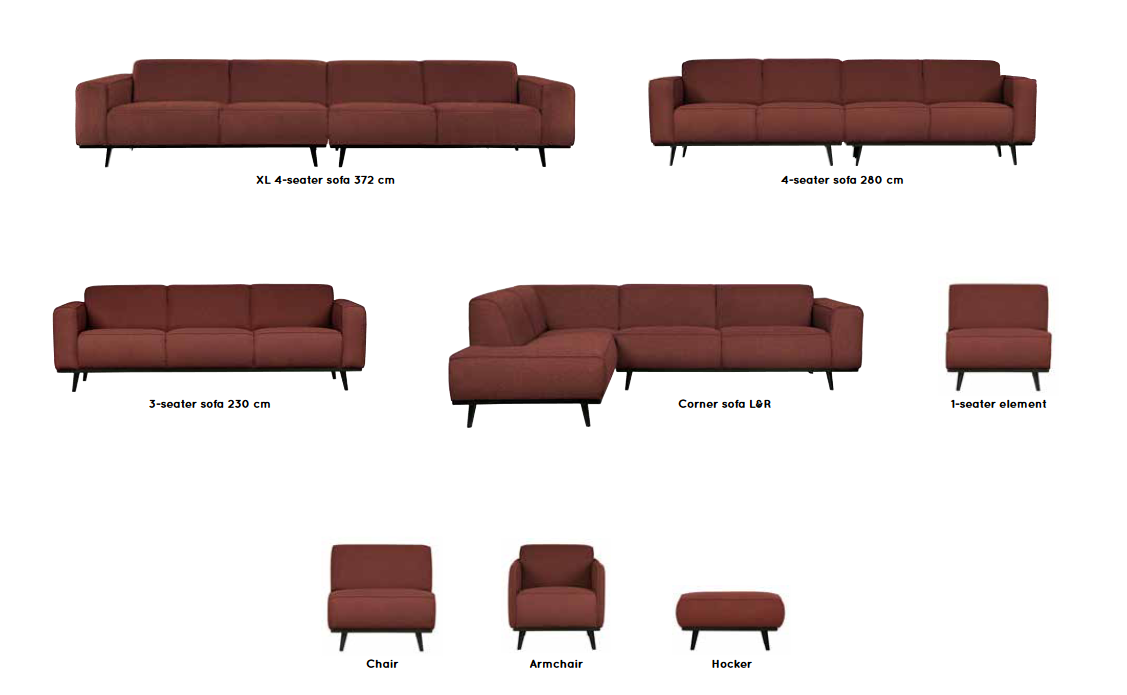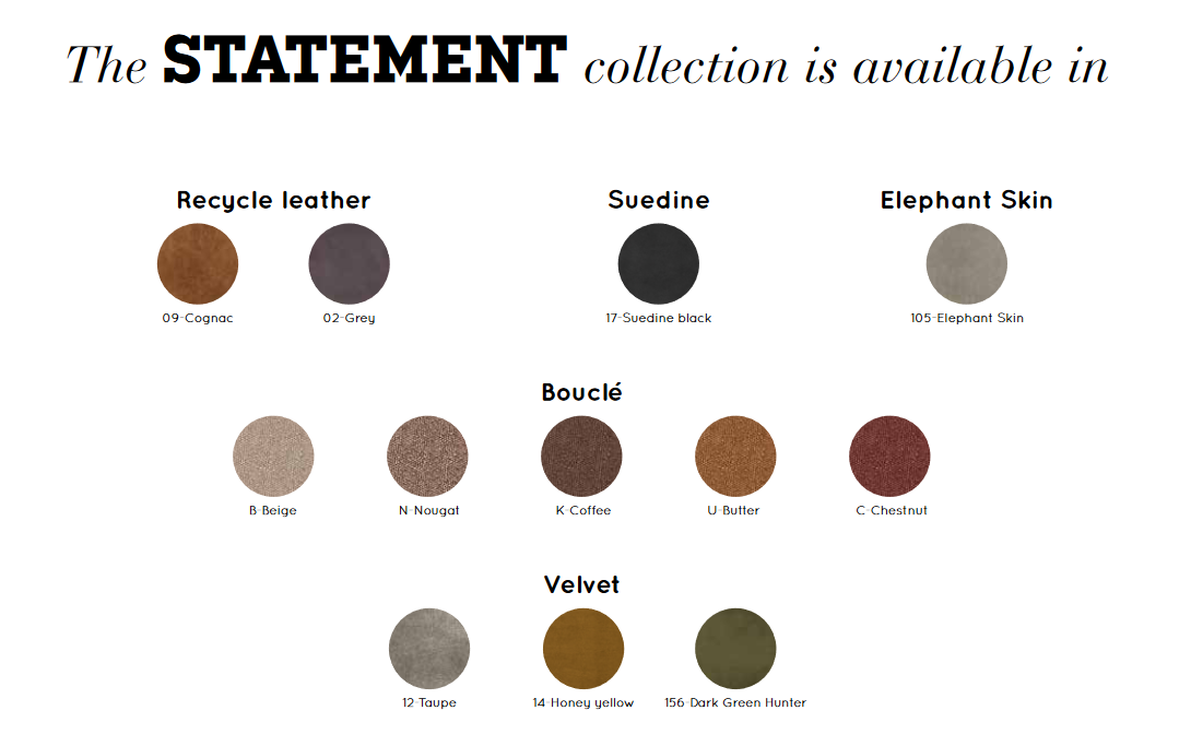 Pierwszą pozycją w kolekcji Statement była skórzana sofa z recyklingu. Projektanci BePureHome chcieli stworzyć solidną sofę o gładkiej i eleganckiej konstrukcji. I na pewno tak było, ponieważ po premierze sofy ze skóry z recyklingu poszerzono ją o różne tkaniny i modele. Kolekcja znacznie się rozrosła. W kolekcji znajdują się nie tylko sofy takie jak narożnik, 3-osobowa, 4-osobowa i 4-osobowa XL, ale także hokery czy fotele. Modele są dostępne w 6 różnych tkaninach i 12 różnych kolorach. Najnowszym dodatkiem jest tkanina bouclé: miękka, milutka i chłodna, dzięki czemu idealnie pasuje do kolekcji Statement.