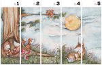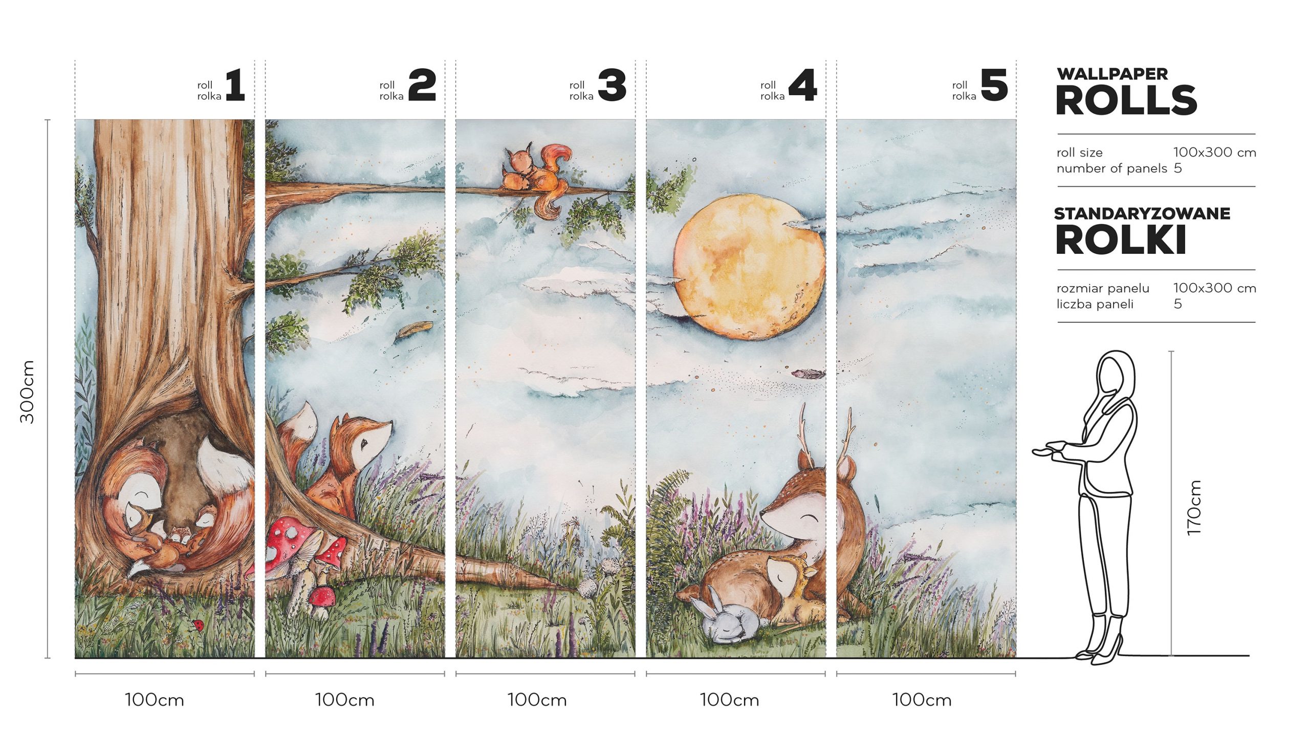 Gdy zmierzch otula pokój łagodnym półmrokiem, tapeta Fox Hollow przekształca ścianę w piękny, kojący pejzaż. Obraz rozłożystego drzewa, namalowanego ciepłymi odcieniami brązu, odsłania śpiącą lisicę z młodymi. W ich pobliżu czuwają sarenka z cielęciem, królik i wiewiórka. Wspaniały, miodowy księżyc zawisa nad koronami drzew, a niebo, w pastelowych barwach błękitu, turkusu i lawendy, delikatnie przechodzi w chmury z subtelnymi, złocistymi akcentami. Czerwone muchomory, biedronka oraz piórko dopełniają całość, przypominając kadr z ulubionej książki na dobranoc.