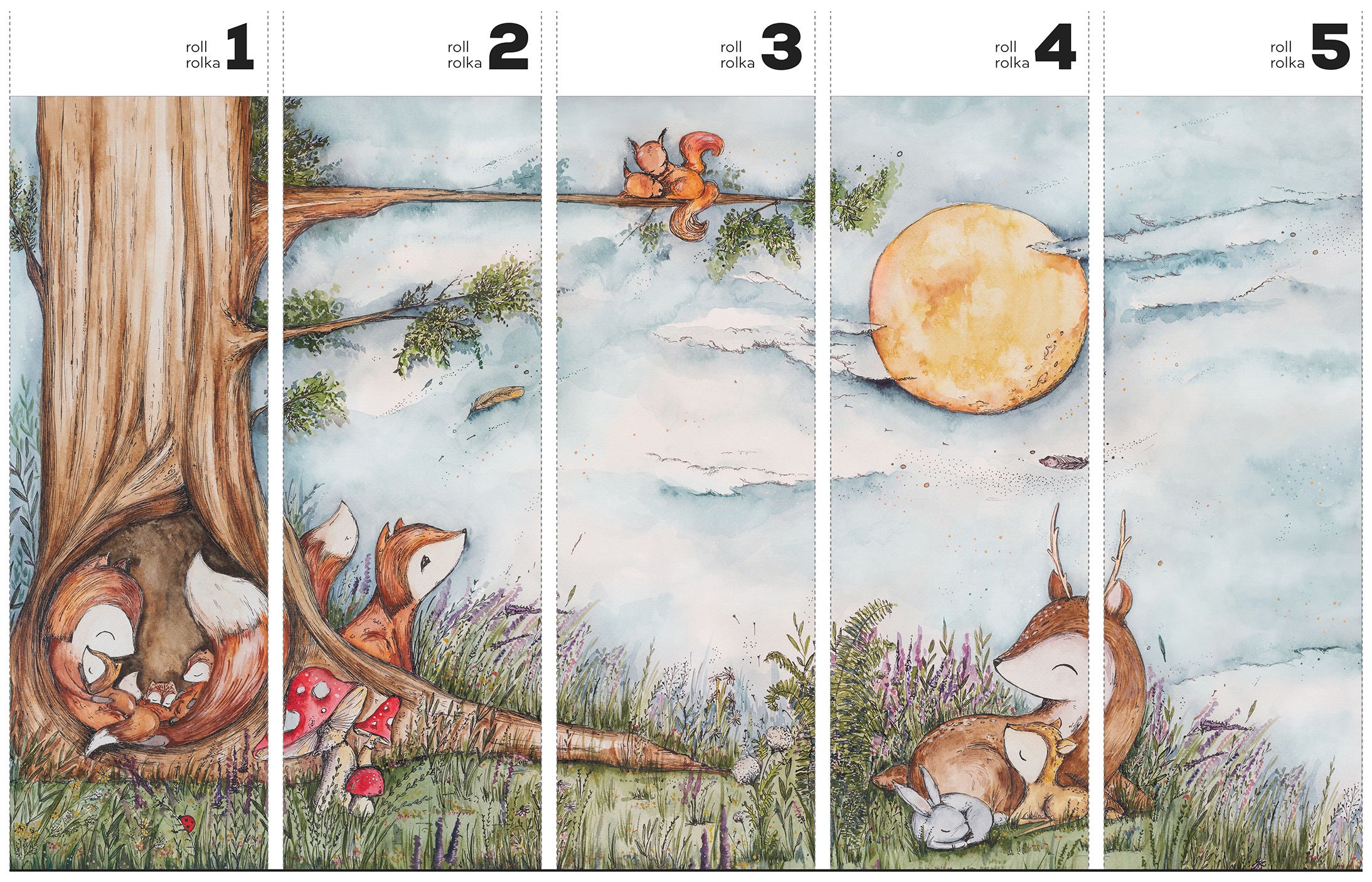 W cieniu drzew lisia rodzinka szykuje się do snu. Otwarta kompozycja wzoru przeniesie Ciebie i Twojego malucha do świata baśni, dając możliwości kreatywnej aranżacji wnętrza. Ciepłe, barwne kolory wzoru pozwolą na urządzenie pokoju dla dziecka w dowolnej kolorystyce. Idealnie wpasuje się w nowoczesne wnętrze lub urządzone w stylu naturalnym czy boho.