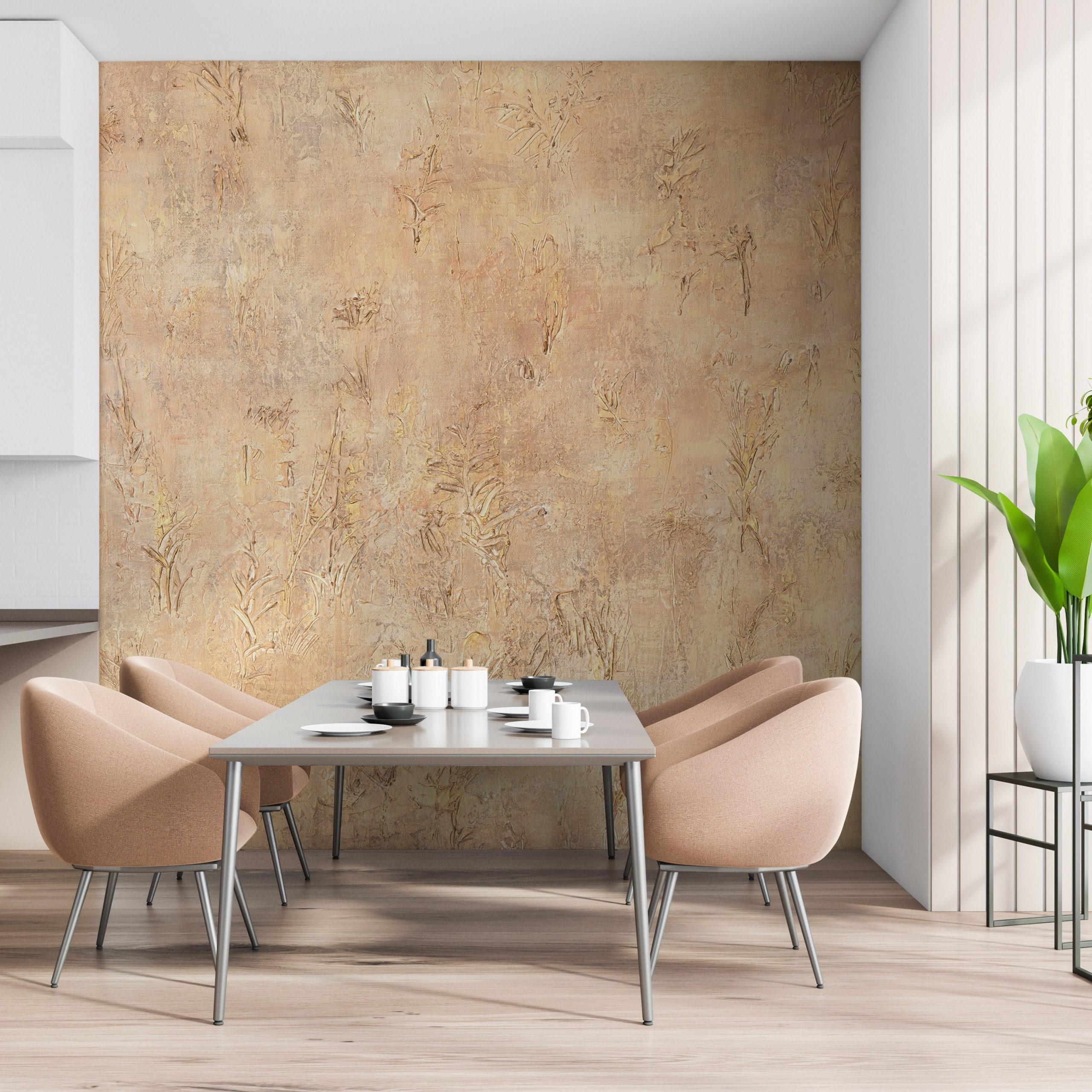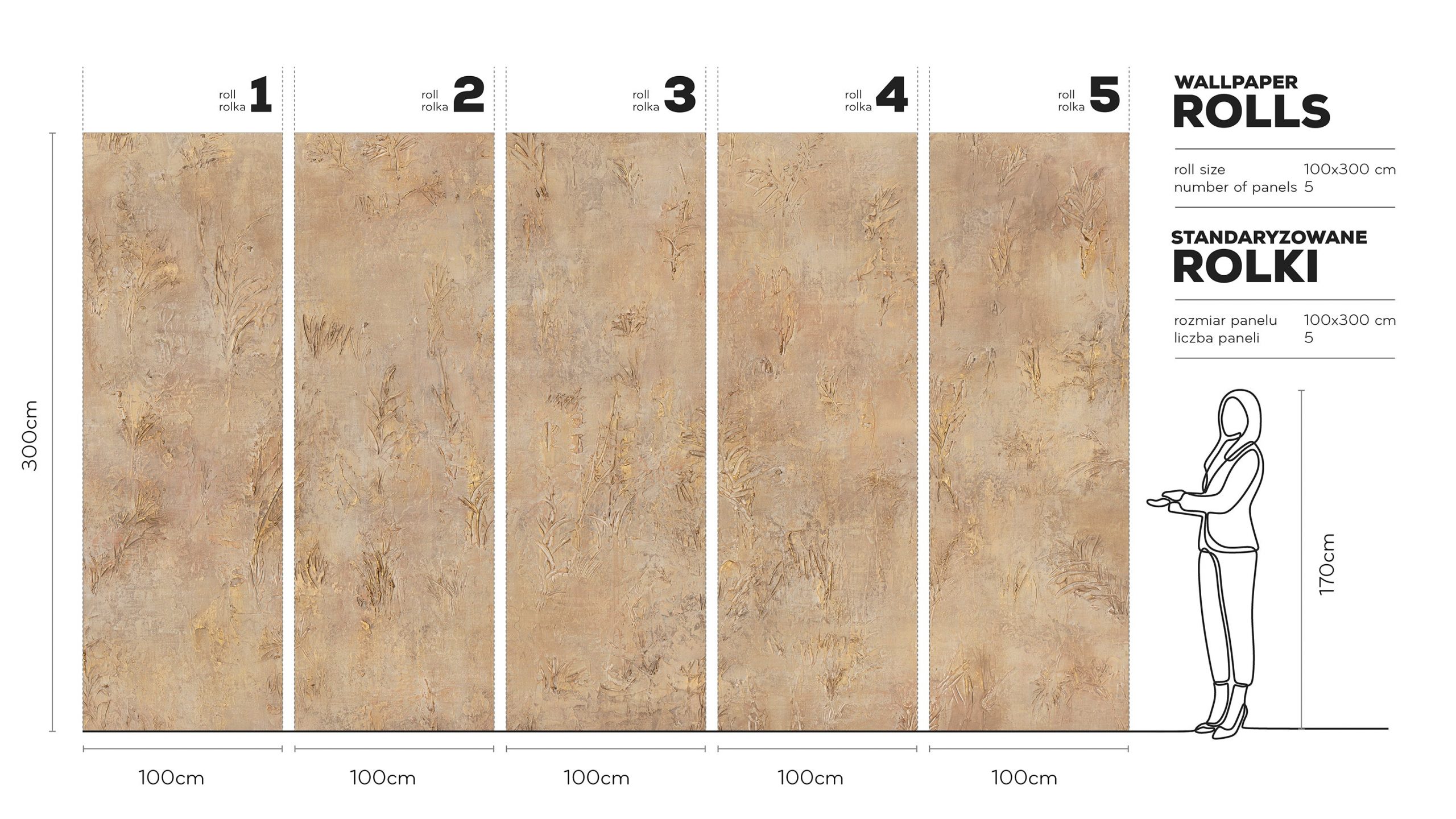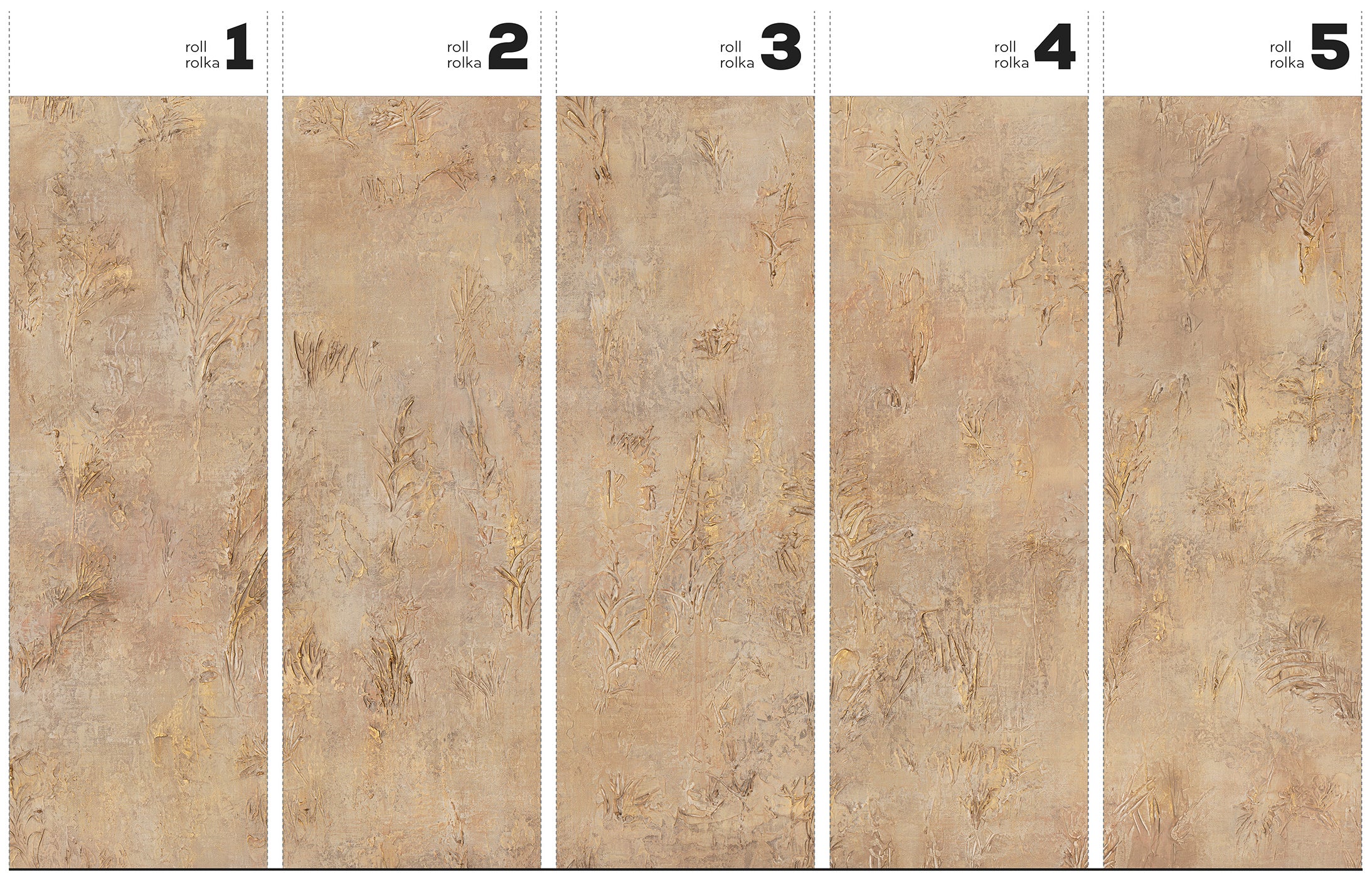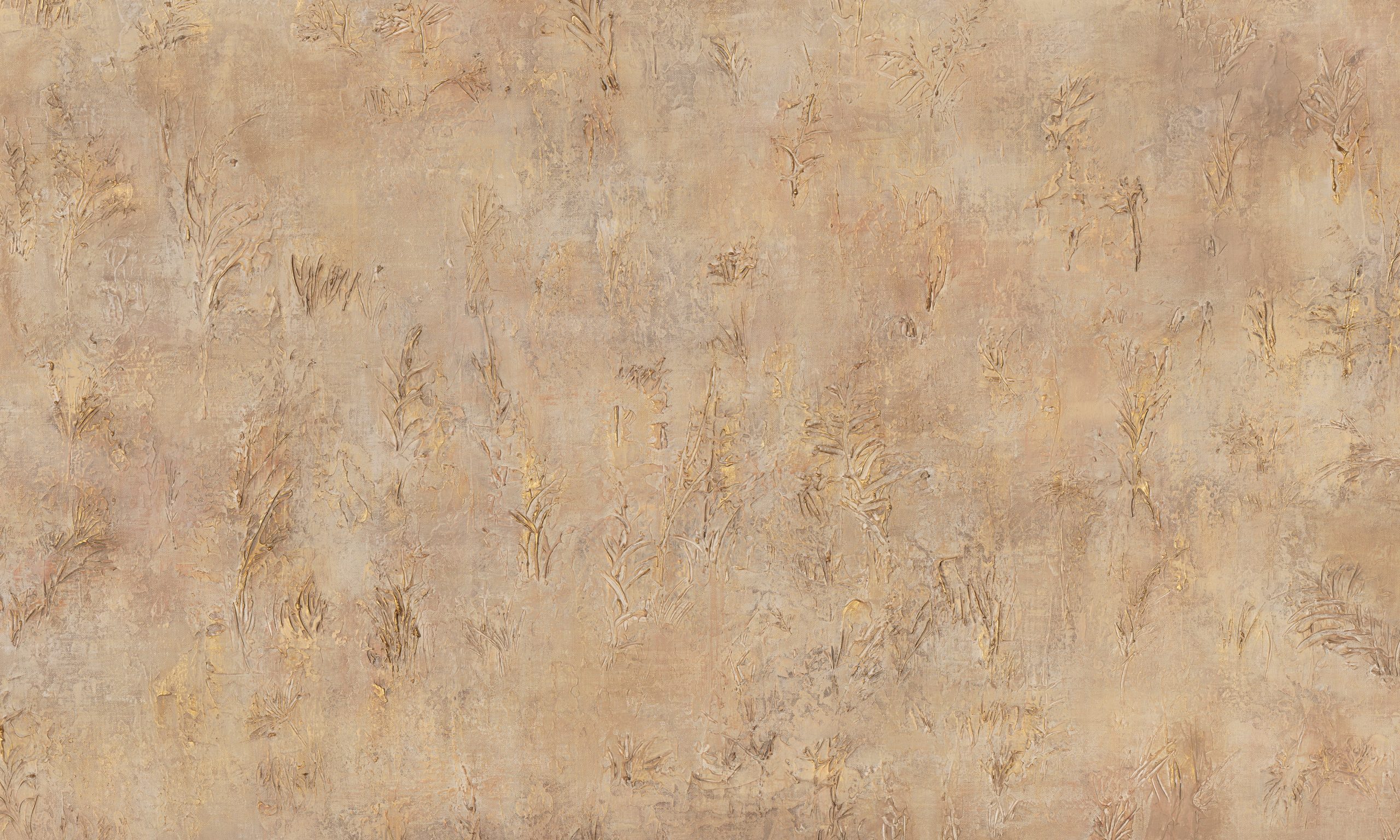 Motyw tapety oparty jest na organicznym abstrakcjonizmie i ma malarski charakter. Nieregularne formy przypominają wysuszone rośliny, łodygi i liście, jakby były odciśnięte w glinie. Trójwymiarowy efekt sprawia, że światło płynnie przesuwa się po “reliefie”, ukazując strukturę i ocieplając przestrzeń. Dzięki unikalnej kompozycji, tapeta działa jak artystyczna, ciągła płaszczyzna. Połączenia brytów stają się mniej widoczne, a drobne niedoskonałości ściany są wizualnie wygładzane.