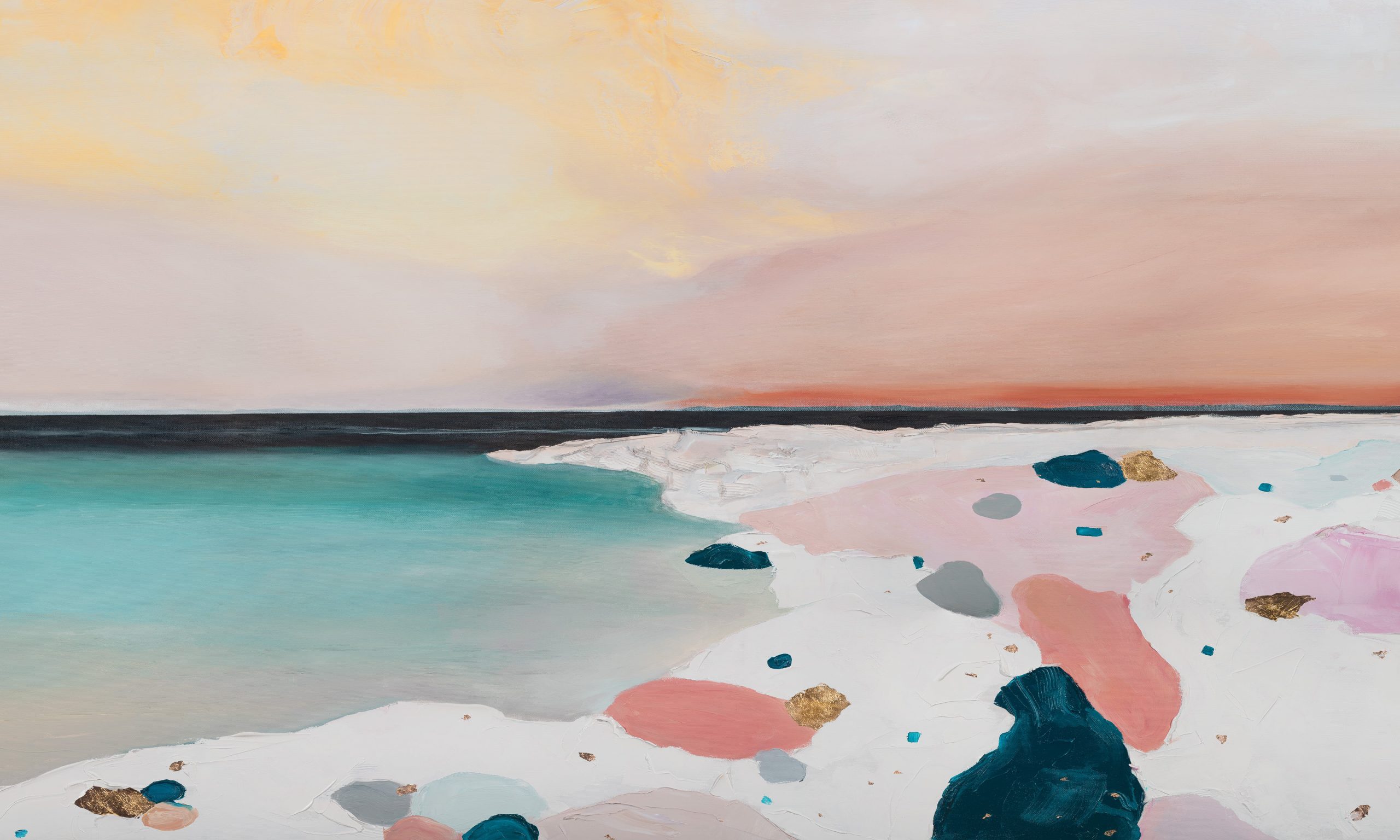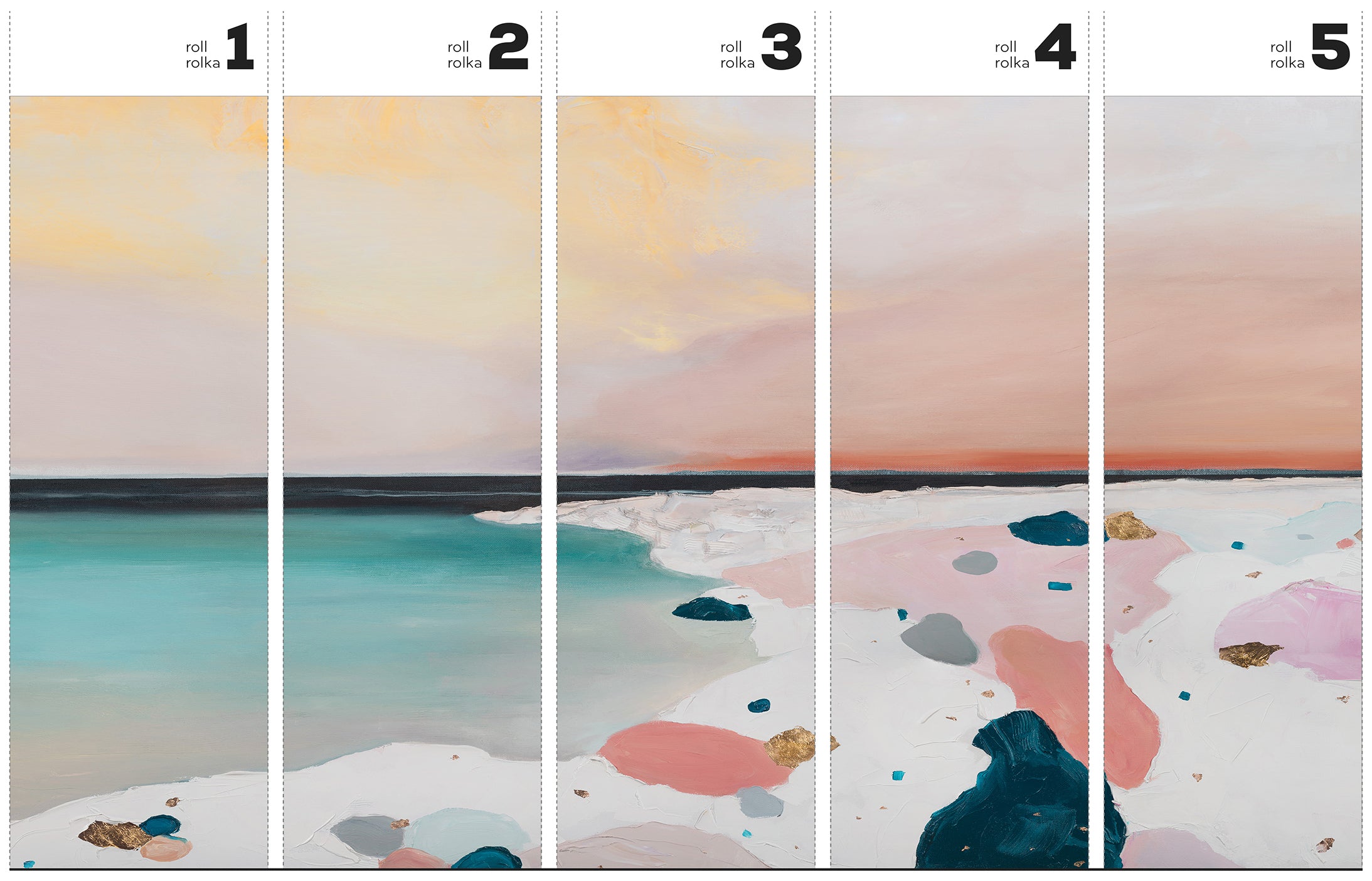 Wyobraź sobie ścianę, która tchnie porannym światłem nad oceanem. Fuerta to tapeta w standardowych rolkach, która zmienia przestrzeń w pastelowy, abstrakcyjny pejzaż. Pudrowe róże i brzoskwinie płynnie przechodzą w kremową biel i jasny żółty. W połowie kompozycji ustępują miejsca stonowanemu turkusowi, granatowi i szarościom z subtelnymi, złotawymi akcentami. To malarska scena, która zachęca do kontemplacji. Miękkie pociągnięcia pędzla, impastowa faktura i organiczne kształty tworzą horyzont, fale i światło, wprowadzając spokój oraz marzycielskie ukojenie do wnętrza.