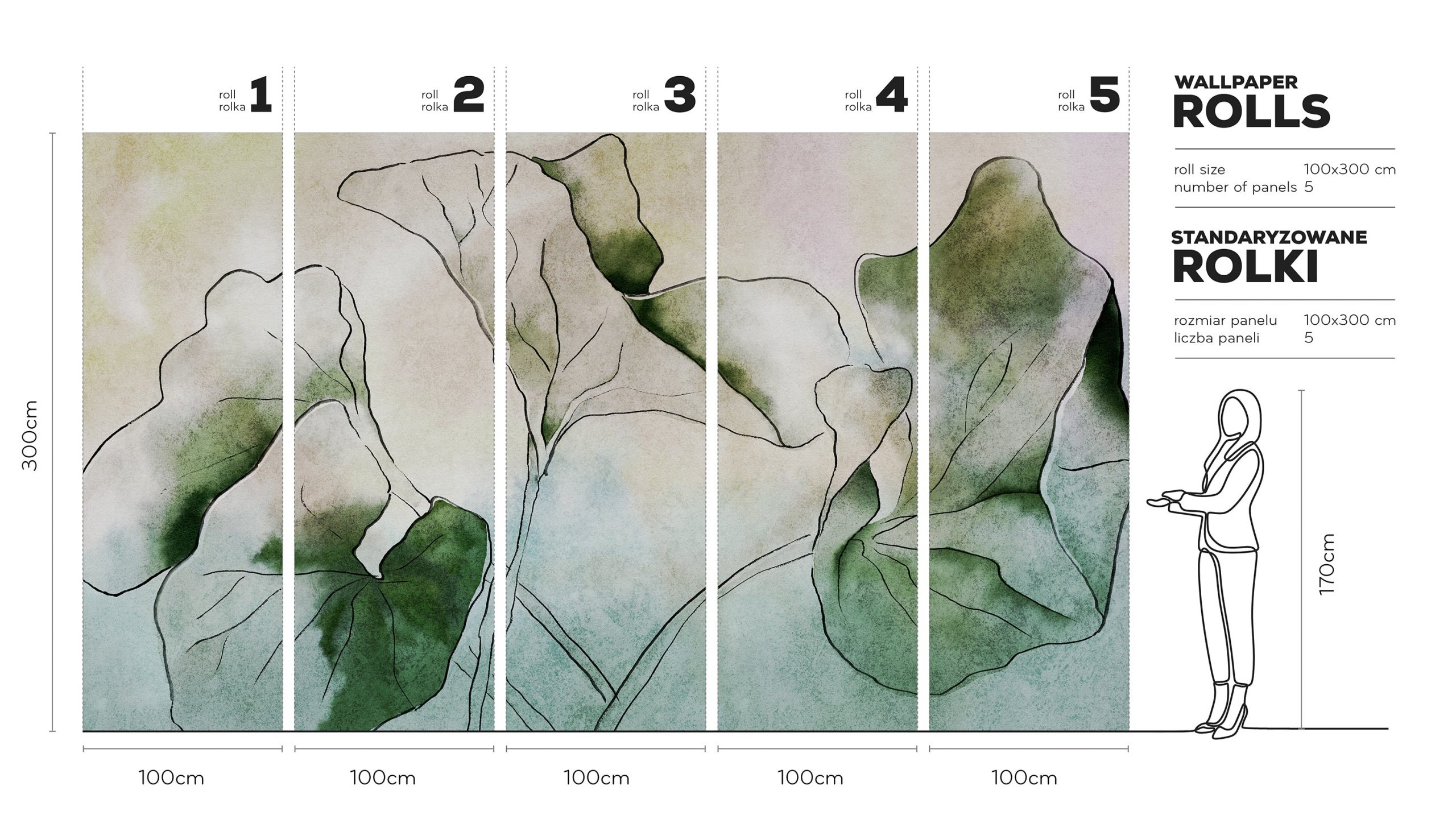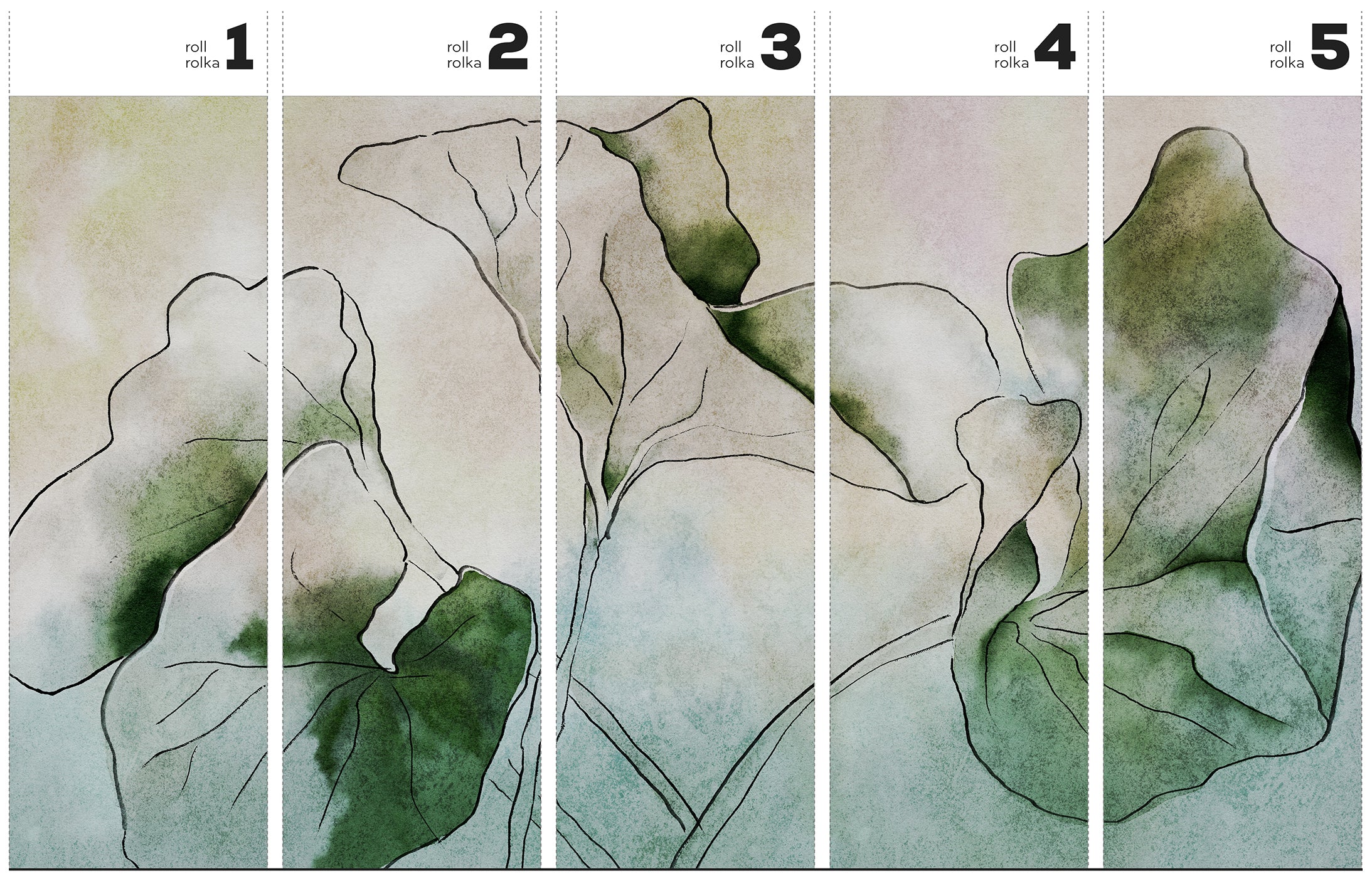 Hasu – Tapeta w standaryzowanych rolkach to kojąca wizja natury, stworzona techniką akwarelową. Wyróżnia się dużą, płynącą kompozycją, która przyciąga wzrok. Paleta kolorów obejmuje subtelne odcienie zieleni: od leśnych, przez oliwkowe i miętowe, aż po delikatne pastele. Spotyka się tu również miękkie przejścia bieli, beżu i szarości. Cienkie, nieregularne linie szkicują organiczne formy liści, inspirowane japońskim malarstwem tuszem i nowoczesnym stylem japandi.