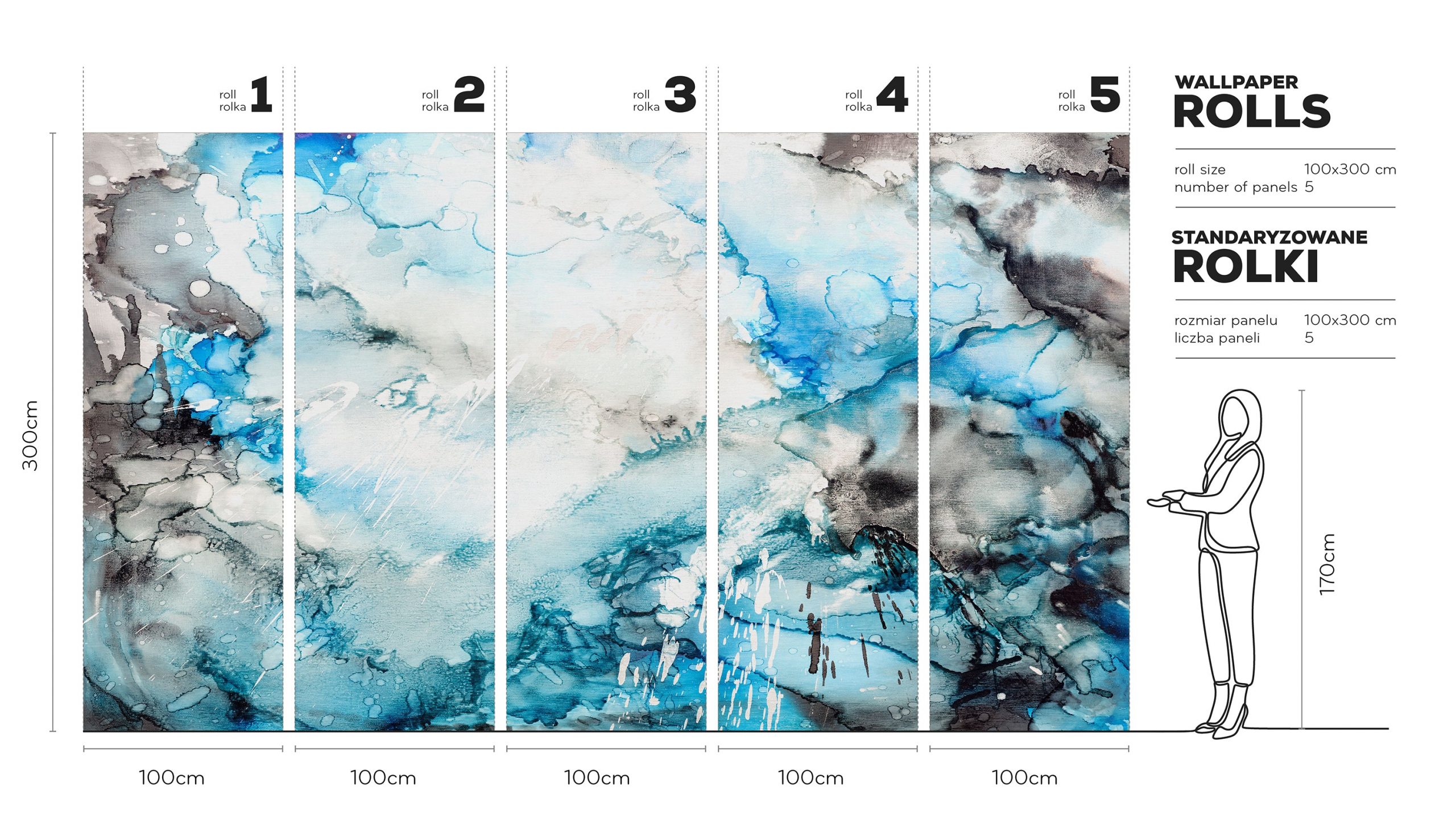Wyobraź sobie taflę jeziora, nad którą przesuwają się chmury. Tapeta Lago, dostępna w standardowych rolkach, przenosi ten piękny widok na twoją ścianę. W efekcie powstaje artystyczny pejzaż w odcieniach akwamaryny, kobaltu oraz granatu, które przeplatają się ze srebrnym szarością i czystą bielą. Miękkie, akwarelowe przejścia oraz organiczne plamy tworzą kompozycję o muralowym rozmachu. Jest dynamiczna, ale również wyciszająca, idealna do wnętrz, gdzie spokój i nowoczesna elegancja są najważniejsze.