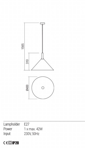 Lampa z aluminium pomalowana na kolor czarny mat, aluminiowy klosz pomalowany na kolor metalowy z zewnątrz i matowy biały wewnątrz. Wymiary: jak na rysunku Dane techniczne: Oprawka: E27 Zasilanie: 230V...