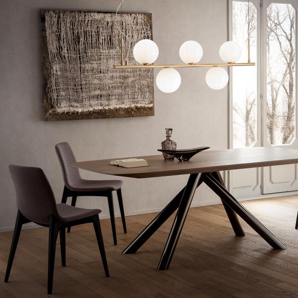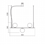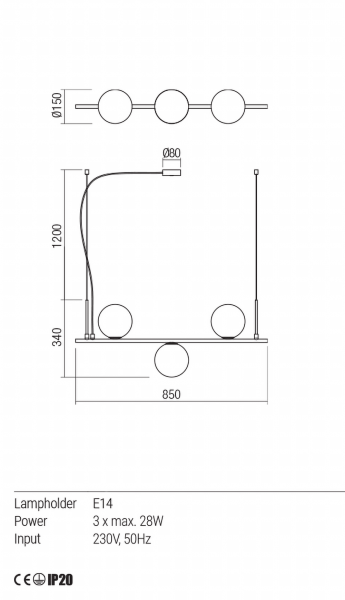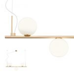 Zawieszenie do wnętrza, metalowa konstrukcja ze szczotkowanym brązowym wykończeniem, dmuchany klosz z mlecznego szkła i kabel z białej tkaniny. Wymiary: jak na rysunku Dane techniczne: Oprawka: E14 Zasilanie: 230V Źródło: 3 x...