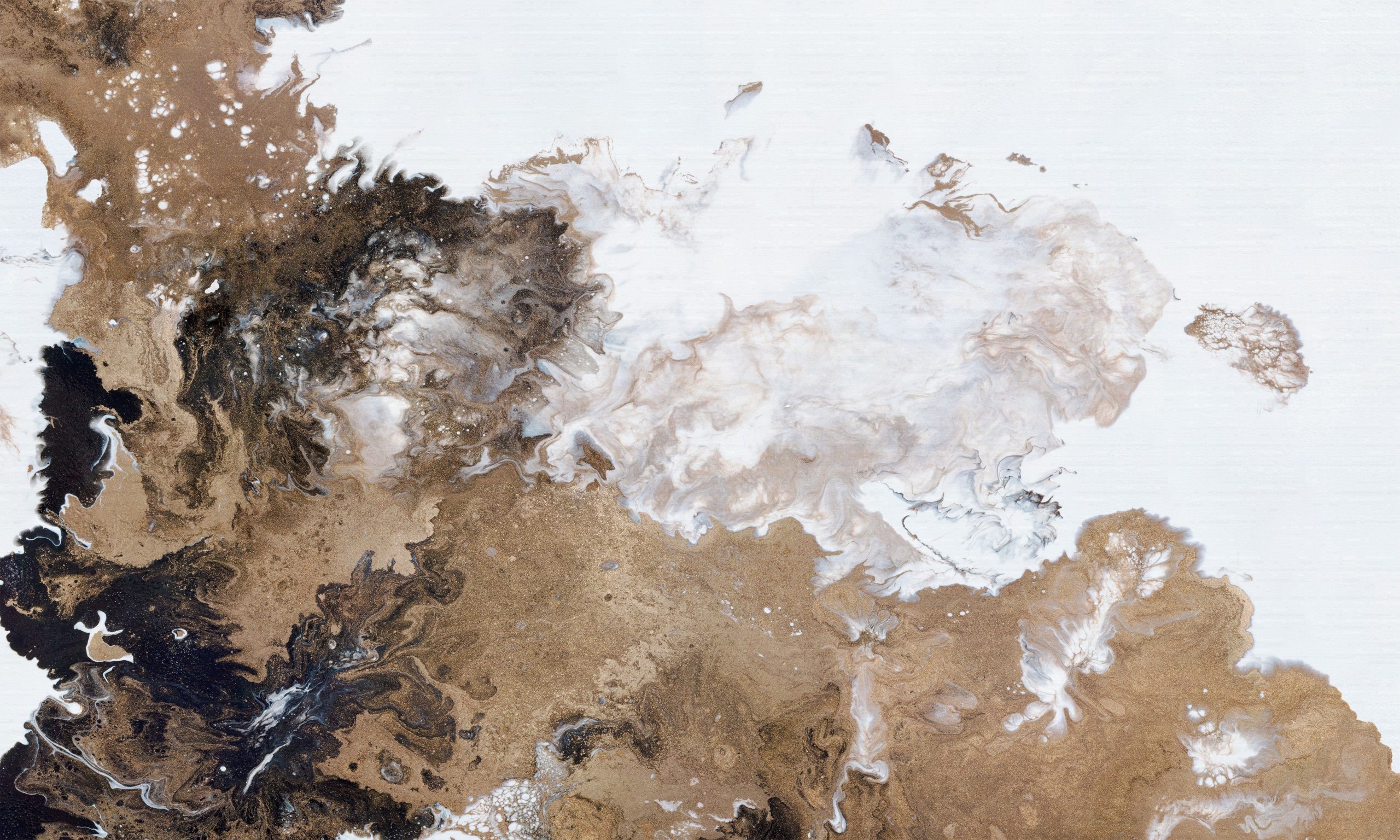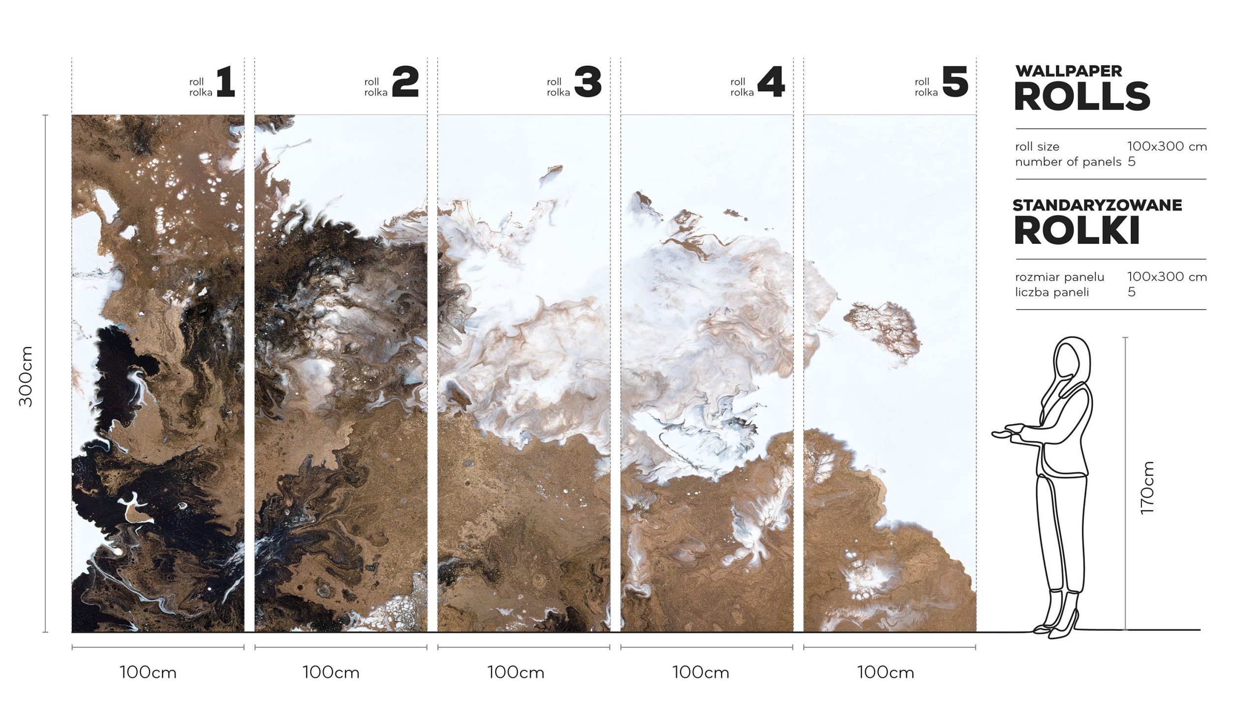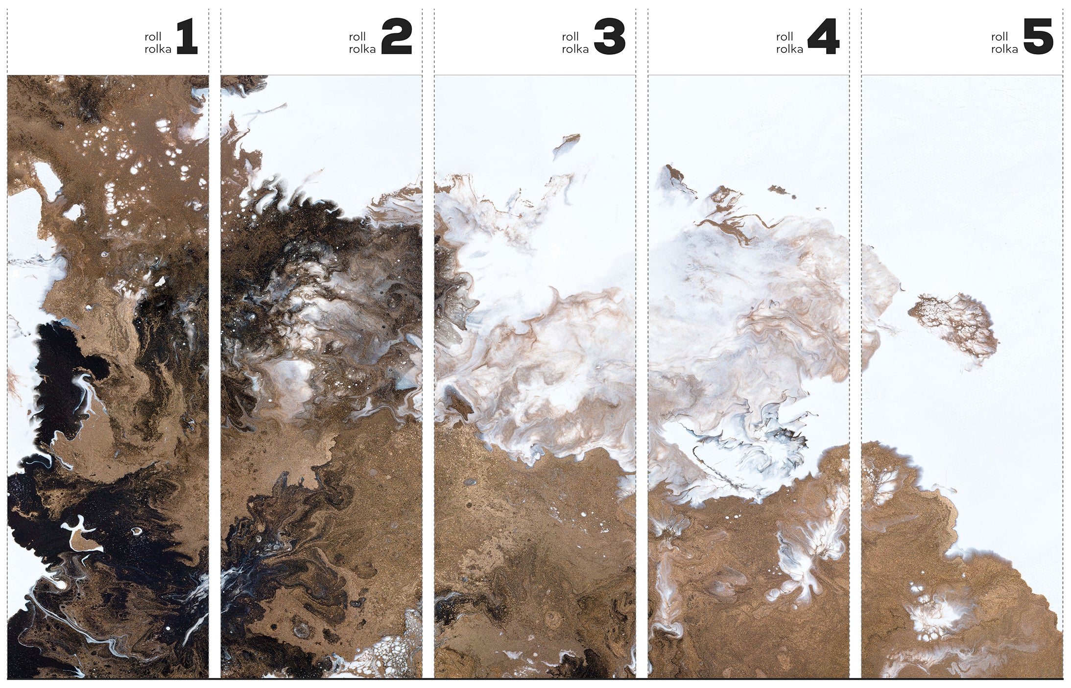Lungo – Tapeta w standaryzowanych rolkach to idealne zaproszenie do wprowadzenia sztuki do wnętrza. Na jasnym tle widzimy intensywne czernie, szarości i delikatne beże. Błyszczące złoto, z nutą brokatu, dodaje luksusowego akcentu. Abstrakcyjna kompozycja przypomina pouring, żywicę czy widoki z lotu ptaka – delty rzek i migotliwe minerały. Ściana staje się hipnotyzującym obrazem.