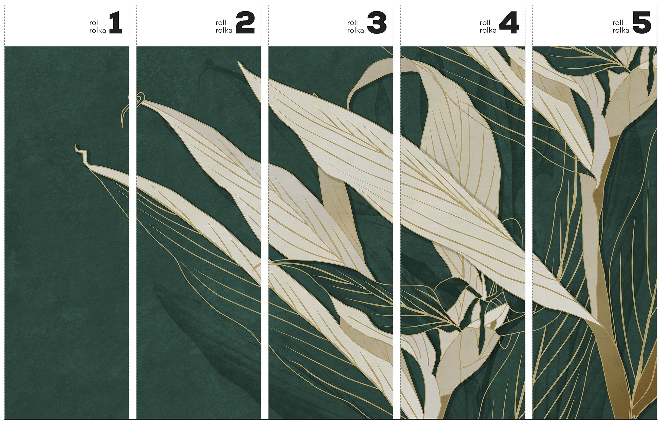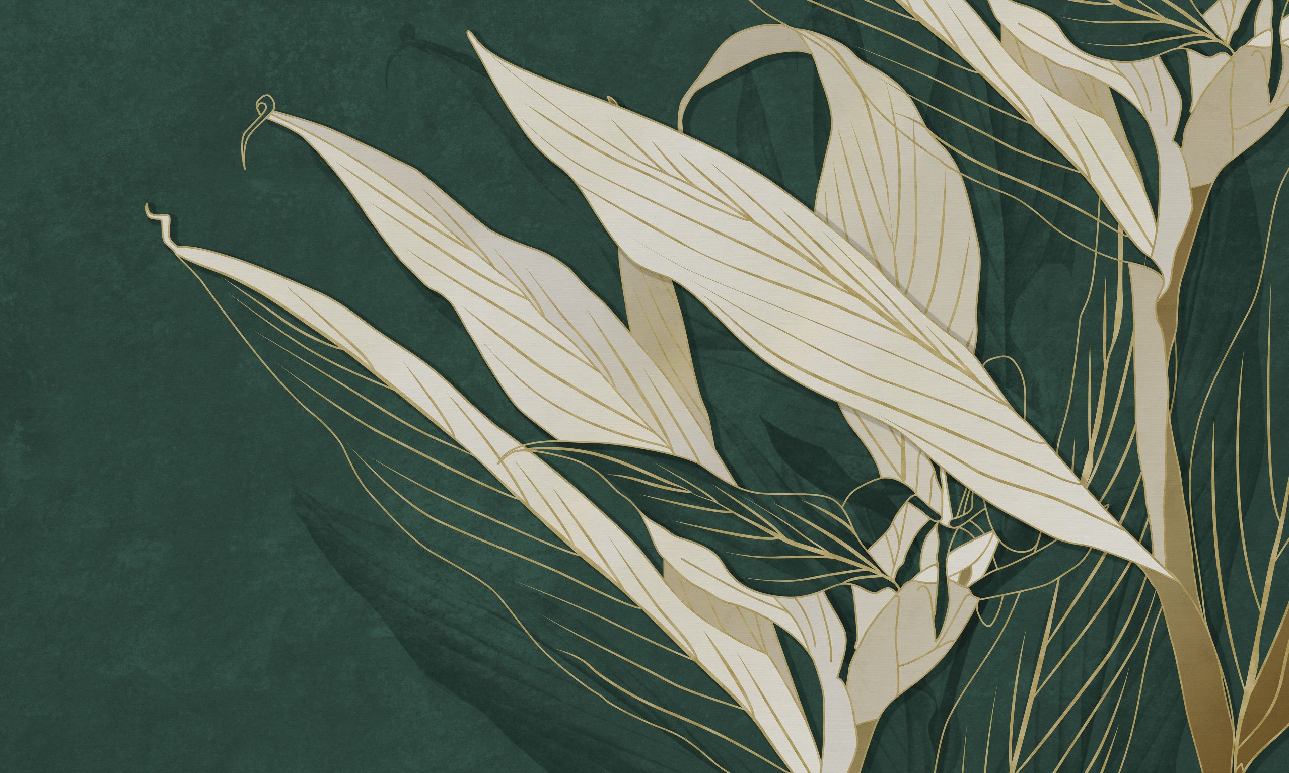 Wejdź w świat kojącej zieleni. Mirai – Tapeta w standardowych rolkach zamienia ścianę w elegancki, botaniczny krajobraz. Kremowe liście o złotych konturach wyłaniają się z głębokiego, szmaragdowego tła. To muralowa kompozycja – harmonijna i płynna – która wprowadza atmosferę wyciszonego luksusu i nowoczesnej elegancji.