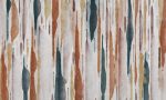 Paleta kolorów jest wyrafinowana i ziemista. Głęboki turkus i zieleń butelkowa łączą się z terakotą, rdzawą pomarańczą oraz musztardą, a całość wzbogacają akcenty fioletu i śliwkowych brązów na tle złamanej bieli. Kolory płynnie się przenikają, tworząc subtelne gradienty. Widoczna, “papierowa” struktura nadruku potęguje wrażenie ręcznie malowanego obrazu. To design celebrujący organiczną niedoskonałość — szlachetny i nowoczesny, unikający dosłowności.