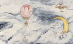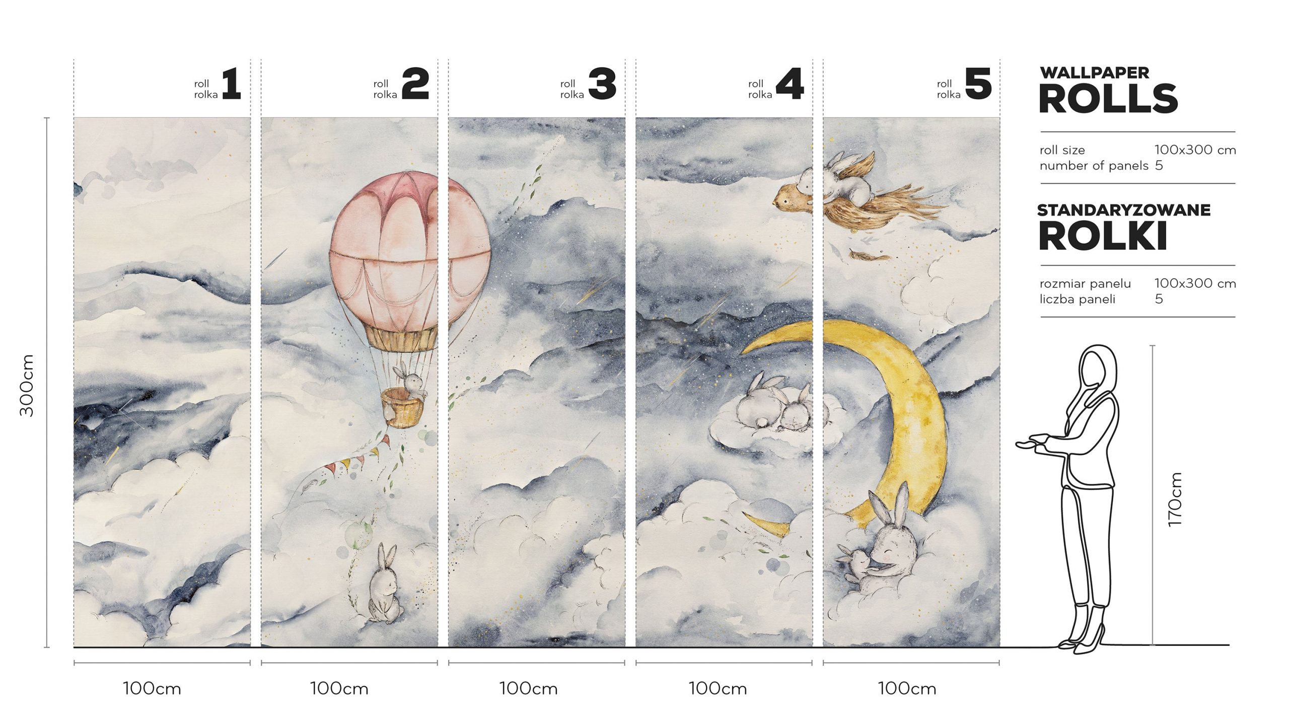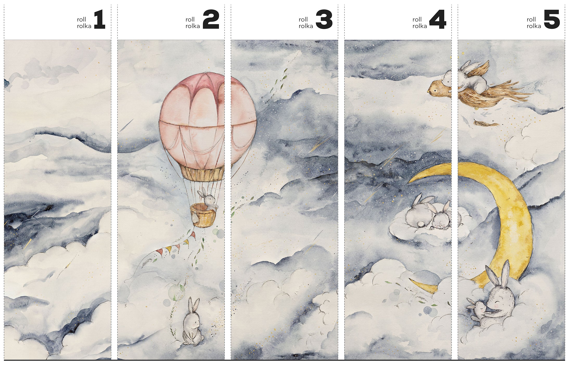 Moonie Blue – Tapeta w standaryzowanych rolkach to nastrojowa akwarelowa opowieść o nocnym niebie. Wprowadza do pokoju ciszę i delikatne światło snu. Na tle błękitów, szarości i rozmytych bieli pojawiają się chmury. Wśród nich półksiężyc o ciepłej żółci oraz złote punkty, które przypominają migoczące gwiazdy. A w tej scenerii podróżują króliczki – śpiące na chmurze, unoszące się w pudrowo-różowym balonie, prowadzone przez ptaka. Ta subtelna narracja rozciąga się na całej ścianie.