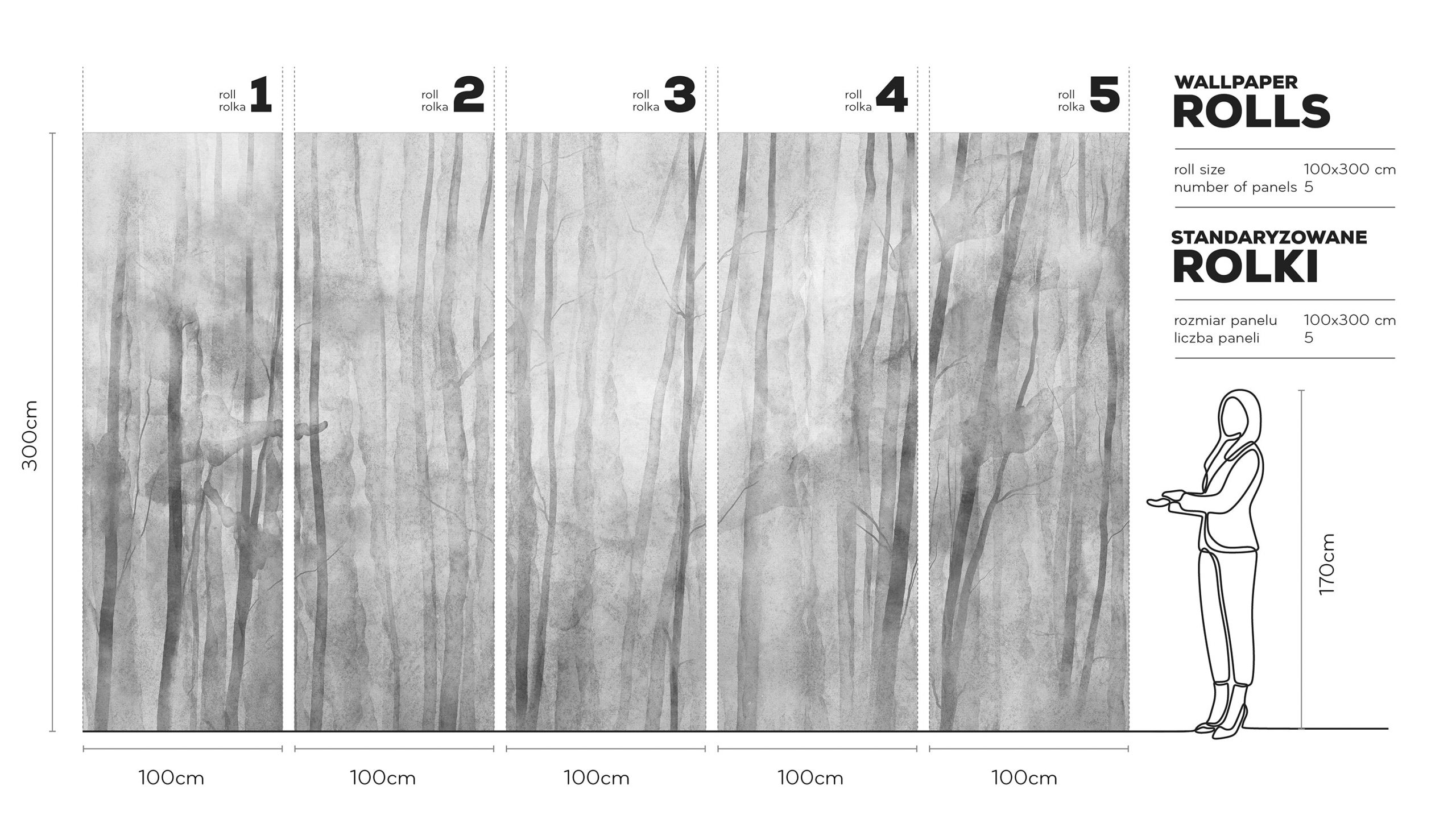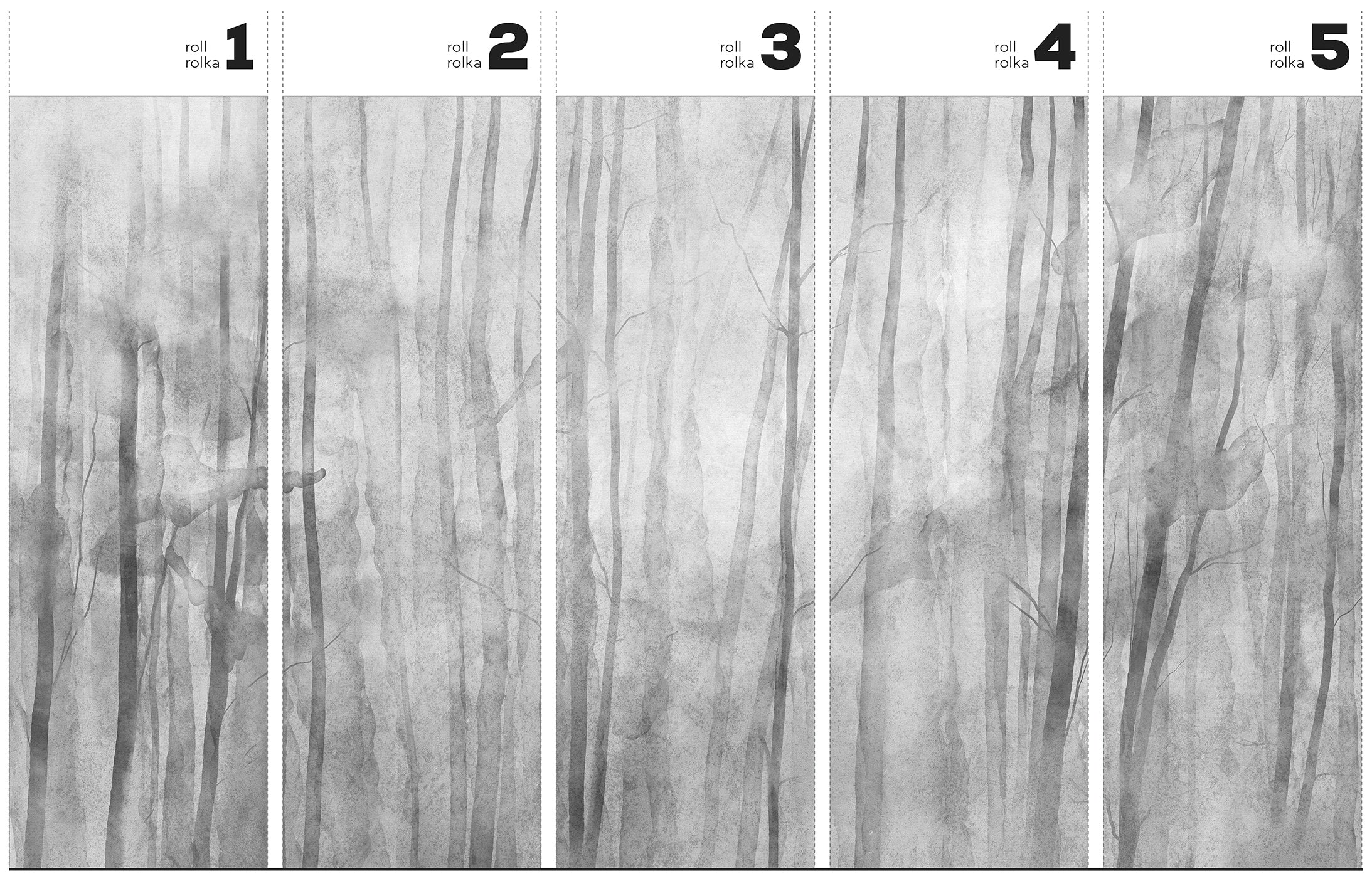 Jak poranny spacer wśród zamglonych pni, Mori Grey – Tapeta w standaryzowanych rolkach, wprowadza do wnętrza miękki pejzaż, który wycisza przestrzeń i nadaje jej elegancję. Monochromatyczna paleta szarości, od ciepłych beżowych tonów tła po ciemne grafitowe cienie drzew, tworzy harmonijną kompozycję. Optyczne porządkowanie oraz delikatne “podwyższanie” wnętrza zapewnia subtelny rytm pionów.