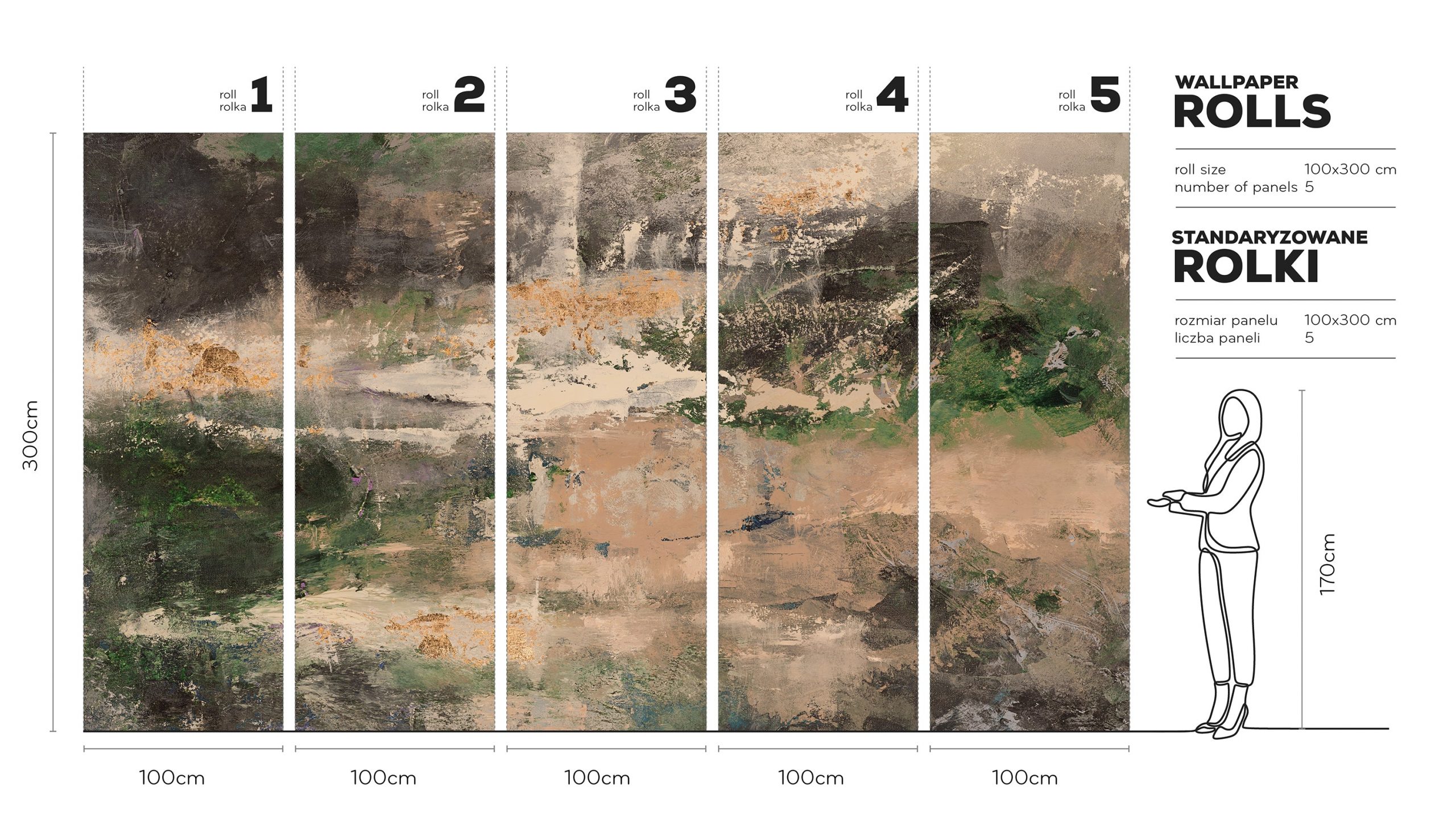 Unikatowość tego wzoru tkwi w braku powtarzalności. To ciągła, wielkoformatowa kompozycja, która na ścianie przypomina monumentalny obraz. Mimo formatu w rolkach, pasy tworzą spójną narrację kolorów i faktur, co daje efekt muralu. Tapeta została stworzona na podstawie ręcznie malowanego dzieła, a precyzyjny druk wiernie oddaje ziarnistość pędzla oraz finezyjne przejścia tonalne. Zapewnia to nasyconą, szlachetną paletę i wyrafinowane, matowe wykończenie.