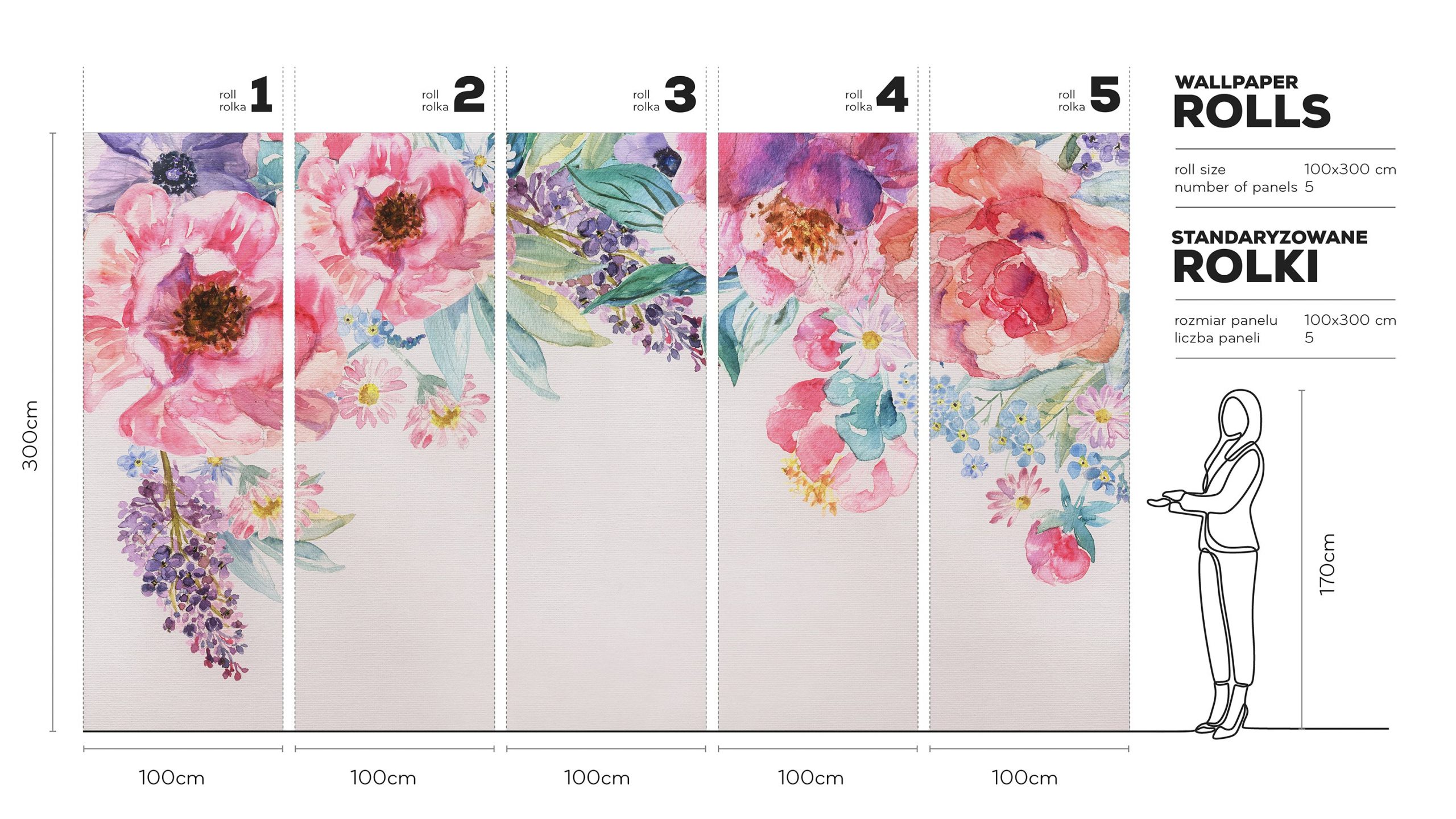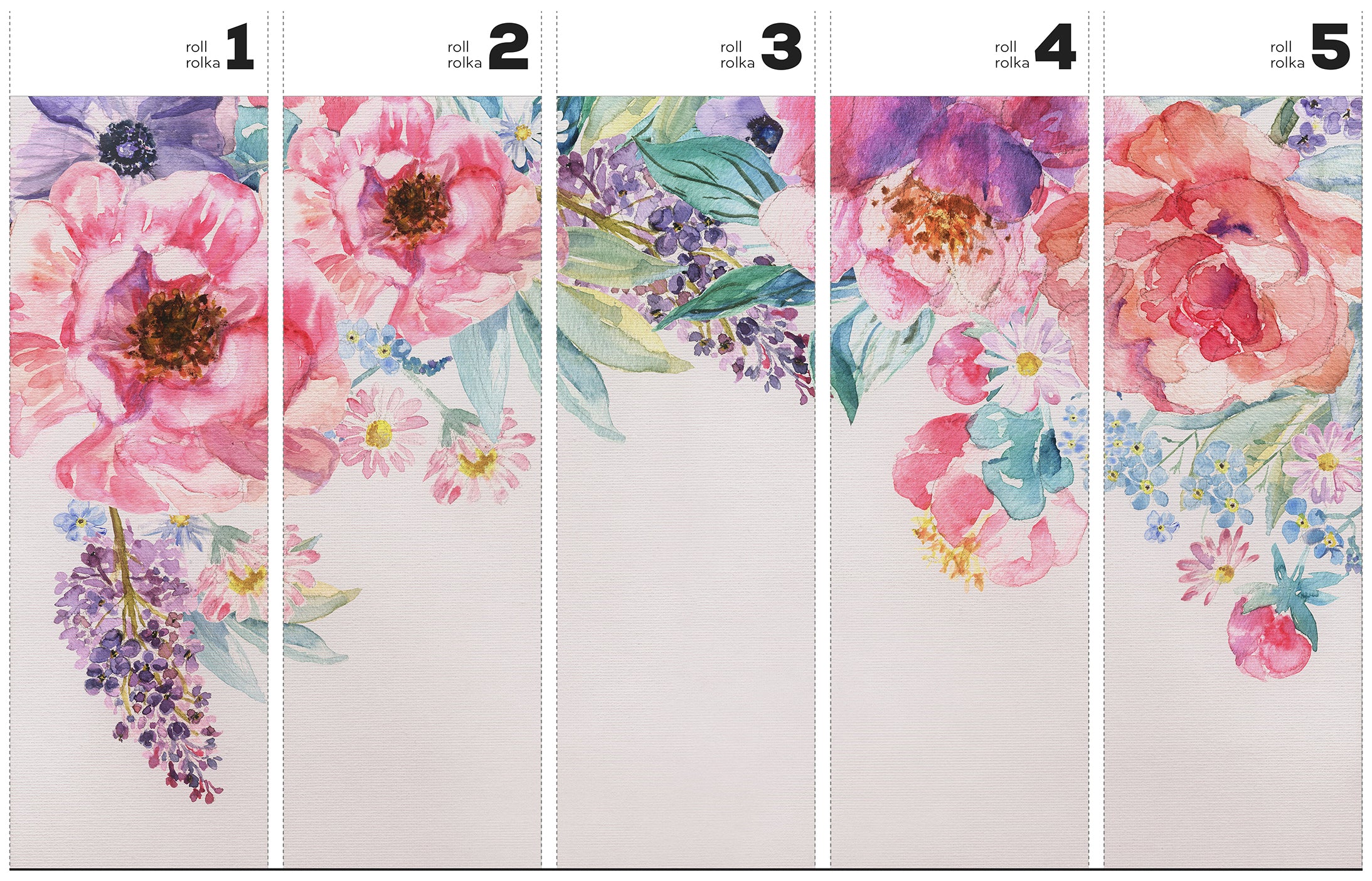 Kompozycja koncentruje się w górnej części ściany i kaskadowo opada w dół, tworząc spójny chmurkowaty układ kwiatów. Jasne tło, takie jak biel lub krem, stanowi idealną scenę dla palety różów – od pudrowych po fuksję, z lawendowymi i śliwkowymi akcentami. Świeże odcienie zieleni przełamane są odrobiną błękitu i turkusu. Akwarelowe przejścia tonalne nadają wzorowi lekkości i miękkości. Estetyka tapety przypomina ręcznie malowane obrazy, wprowadzając do wnętrza harmonię i marzycielski spokój.