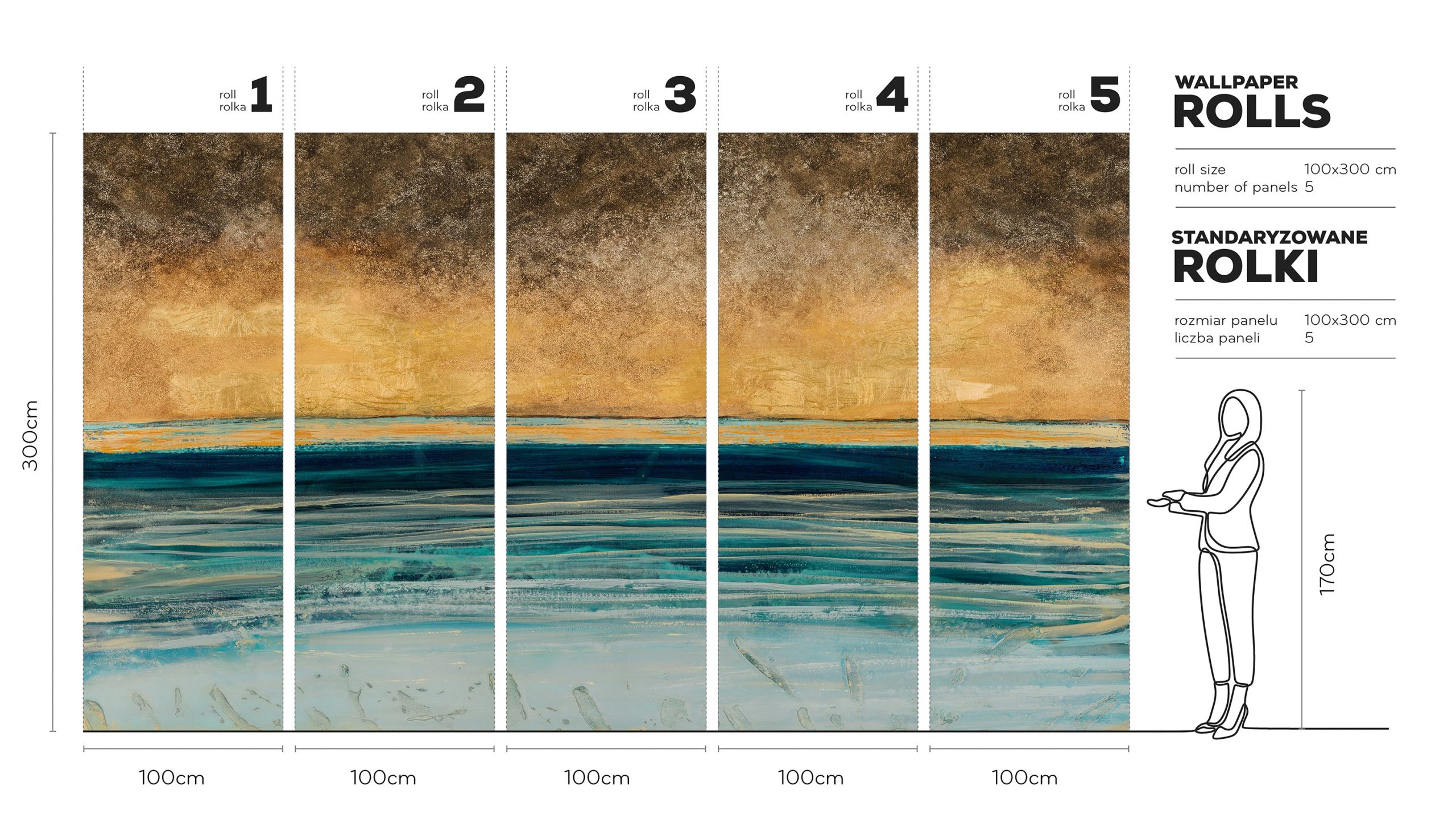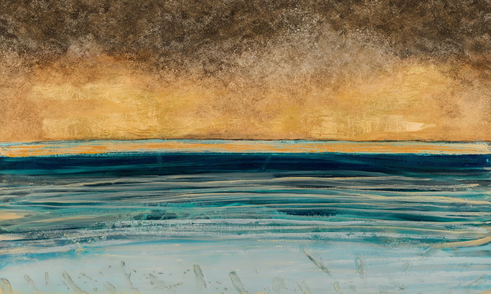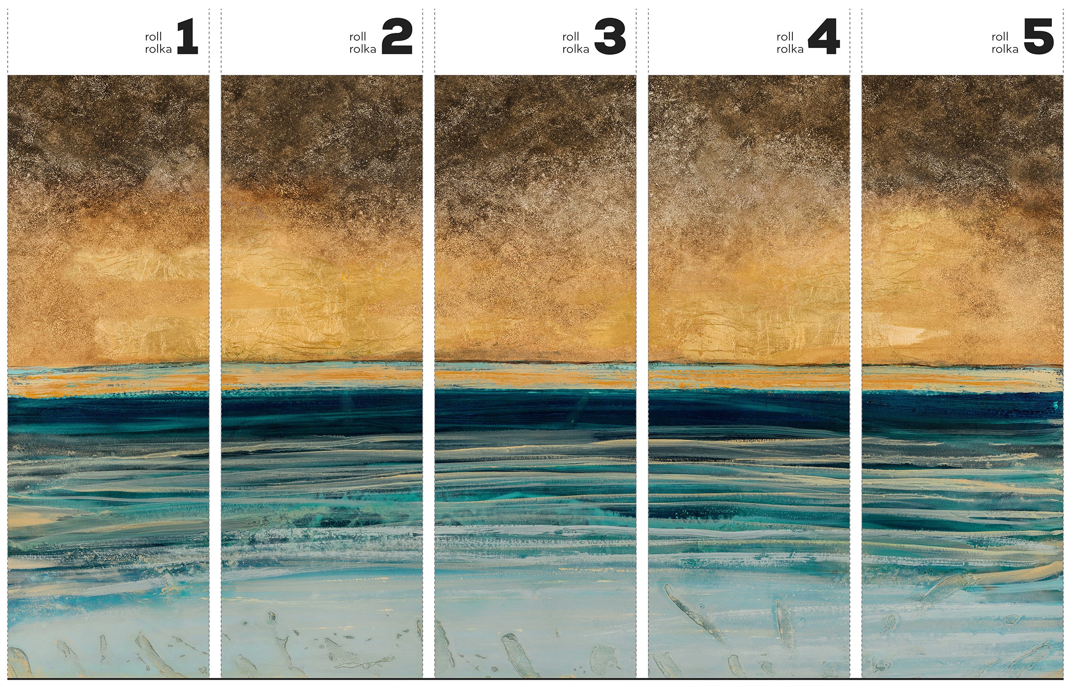 Zaproś do swojego wnętrza spektakularny zachód słońca nad oceanem. Tapeta Pecan to nowoczesna, artystyczna interpretacja morskiego pejzażu. Główne kolory to ciepłe brązy, rdzawy pomarańcz oraz złociste żółcie, które płynnie przechodzą w intensywne turkusy i głęboki granat. Całość kończy się jaśniejszymi błękitami, szarościami i bielą, przypominającymi spienioną taflę wody. Ekspresyjne pociągnięcia pędzla oraz wyczuwalna dynamika nadają ścianie charakter galerii, wprowadzając jednocześnie spokój i elegancję.