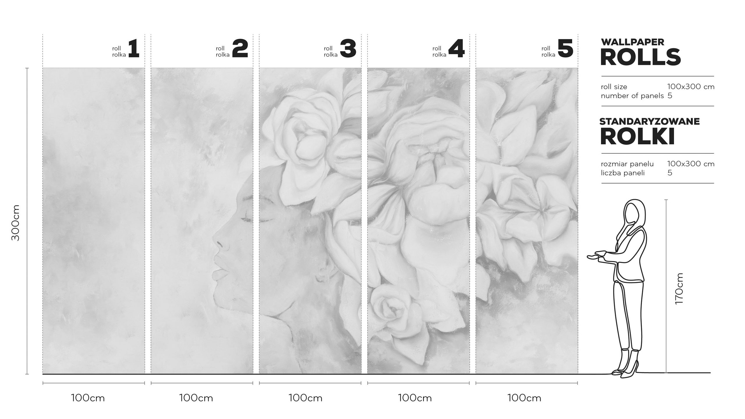 Wyobraź sobie ścianę, która przyciąga wzrok swoją ciszą. Tapeta Persephone Light to wielkoformatowe dzieło nowoczesnego romantyzmu. Przedstawia stylizowany profil kobiety, otoczonej rozkwitającymi kwiatami. Jej malarskie detale i miękkie przejścia w chłodnych odcieniach bieli i szarości nadają wnętrzu elegancję i spokój. Monochromatyczna paleta sprawia, że tapeta harmonijnie stapia się z przestrzenią i jednocześnie ją uszlachetnia.