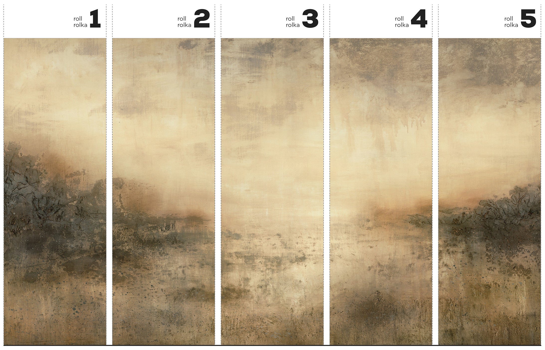 Ristretto – tapeta w standaryzowanych rolkach – to imponujący mural, który zamienia ścianę w olbrzymie dzieło sztuki. Górne partie w ciepłych odcieniach beżu i kremu płynnie przechodzą w kawowe brązy, grafity oraz antracyt. Przy dolnej krawędzi zauważysz migoczące akcenty patynowanej miedzi i oliwkowej zieleni. Ten malarski gradient i wyrazista faktura przypominają erodowane mury oraz zardzewiałe blachy. Oddają one esencję estetyki wabi-sabi w nowoczesnym, industrialnym stylu.