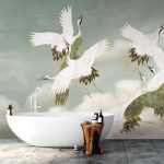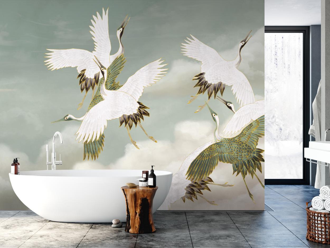 Wzór nawiązuje do estetyki dalekowschodniego malarstwa – między chinoiserie a japońską kaligrafią natury – jednak interpretuje ją na nowo. Kompozycja bez powtarzalnych elementów płynnie rozciąga się na ścianie, tworząc wrażenie głębi i przestrzeni. Rytm lotu, delikatne przejścia tonalne i szczegółowe detale piór nadają scenie dynamikę. Mural jest żywy, ale zachowuje harmonię, co sprawia, że nie męczy oka.