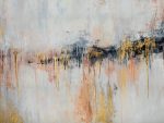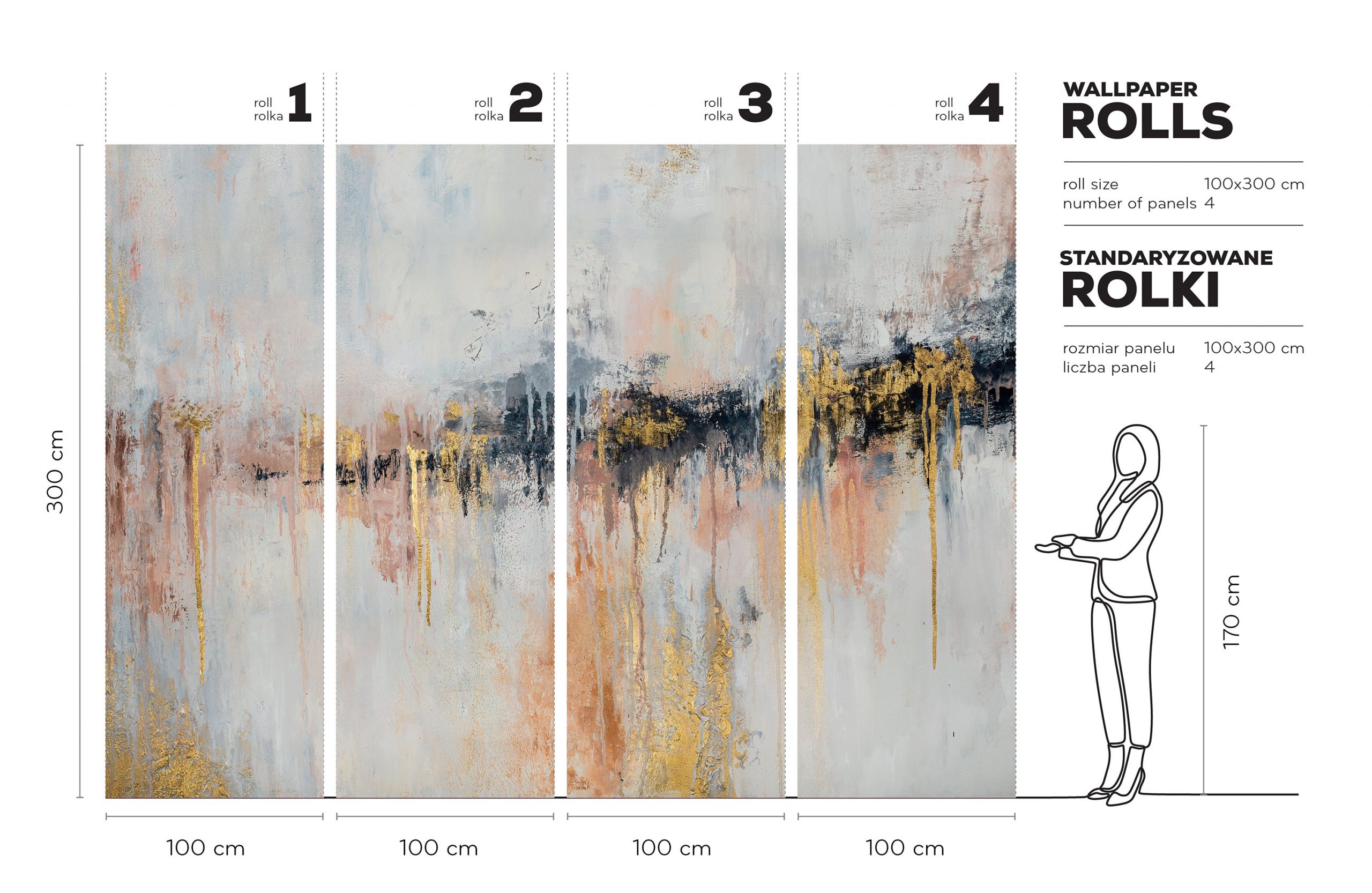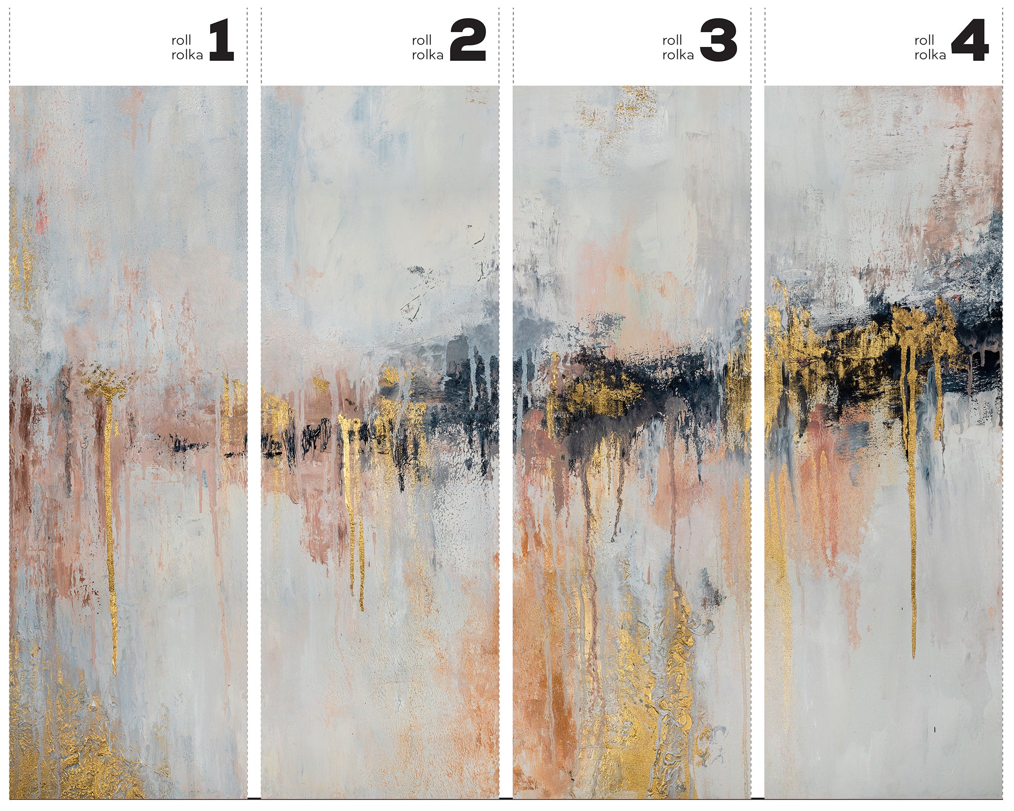 Kompozycja nawiązuje do abstrakcyjnego ekspresjonizmu. Wertykalne zacieki oraz gesty pędzla tworzą rytm, który optycznie wydłuża ścianę. Metaliczne złoto dodaje miękkiego, szlachetnego blasku. Delikatne, rdzawe brązy i stonowane róże łączą wszystko, przypominając skalne formacje z błyskami złotych żył. To nie jest zwykły deseń – każdy pas układa się w fragment większej, spójnej kompozycji, co sprawia, że ściana staje się galerią.