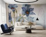 Estetyka tapety łączy nowoczesny styl botaniczny z nutą soft industrial chic. Doskonale współgra z naturalnym drewnem, lnem i ceramiką, ale także ze szczotkowanym metalem, betonem oraz przygaszonym złotem. W salonie podkreśli ścianę za sofą, w sypialni stworzy relaksującą atmosferę za zagłówkiem, a w gabinecie czy butikowym holu doda artystycznej klasy. W świetle dziennym błękity nabierają świetlistości, a wieczorem terakotowe akcenty zyskują głębię.