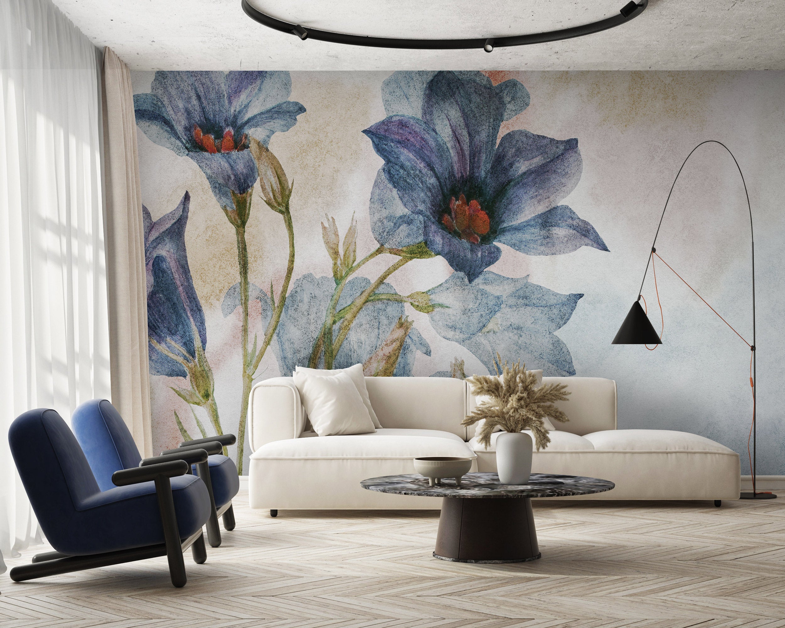 Jak akwarelowe malowidło, Tapeta Antlia wprowadza do wnętrza spokój i elegancję. Na tle przypominającym szlachetny papier akwarelowy, pojawiają się powiększone kwiaty o płynnych konturach. Kolory przechodzą od głębokiego indygo do intensywnego błękitu, a także delikatnych tonów fioletu. Odcienie rdzawo-terakotowe w środkach kwiatów oraz oliwkowe łodygi wnoszą subtelny kontrast, ocieplając całość i dodając kompozycji życia.