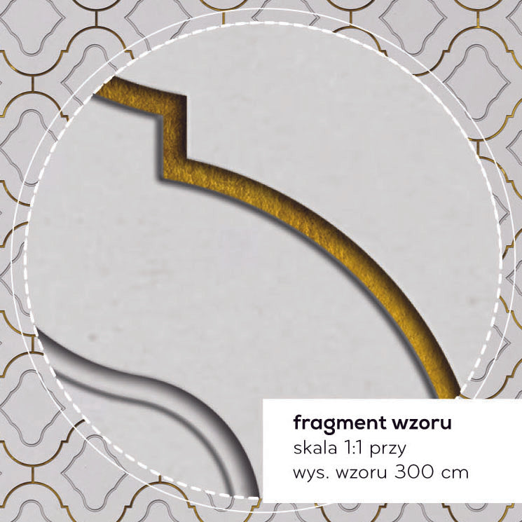 Ten projekt łączy klasyczny ornament z nowoczesną elegancją. Matowe, gładkie tło współgra z satynowym połyskiem złotych detali. W świetle dziennym i wieczornym pojawia się miękki, elegancki blask. Precyzyjny nadruk, wyjątkowo równy, podkreśla płynność krzywizn i czystość linii. Powtarzający się wzór zapewnia doskonałą spójność na całej powierzchni, porządkując optycznie przestrzeń bez wrażenia przesytu.