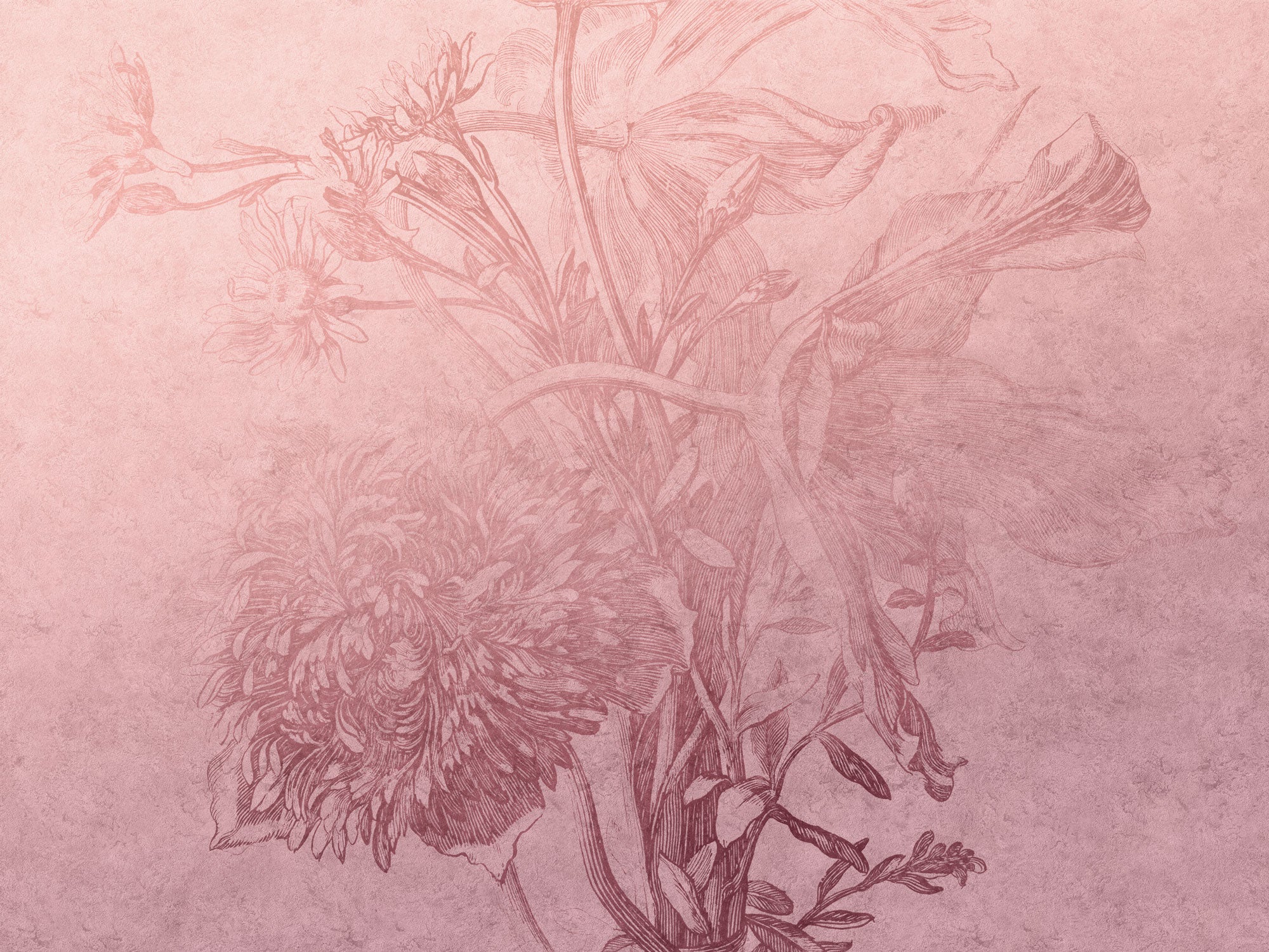 Jak świeżo odkryty botaniczny fresk w pałacowych murach, Tapeta Blossom ombre flower zachwyca zmysły. Jej zgaszony, pudrowy róż płynnie przechodzi w efekt ombre, a na tle rozpościera się duża kompozycja kwiatów i liści, przypominająca dawne ryciny. Subtelna, przydymiona kreska w nieco ciemniejszym odcieniu tworzy wyrafinowany kontrast. Dzięki temu, ściana staje się spokojnym, ale zarazem magnetycznym centrum wnętrza.