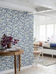 Wydrukowana przy użyciu tradycyjnej prasy drukarskiej, tapeta Citronträd ma delikatną, jasnobeżową bazę z klasycznymi niebieskimi tonami zdobiącymi liście i łodygi drzewa cytrynowego. Same owoce są oddane w miękkim odcieniu beżu i pięknie komponują się z klasycznym, niebiesko-białym wystrojem wnętrza.