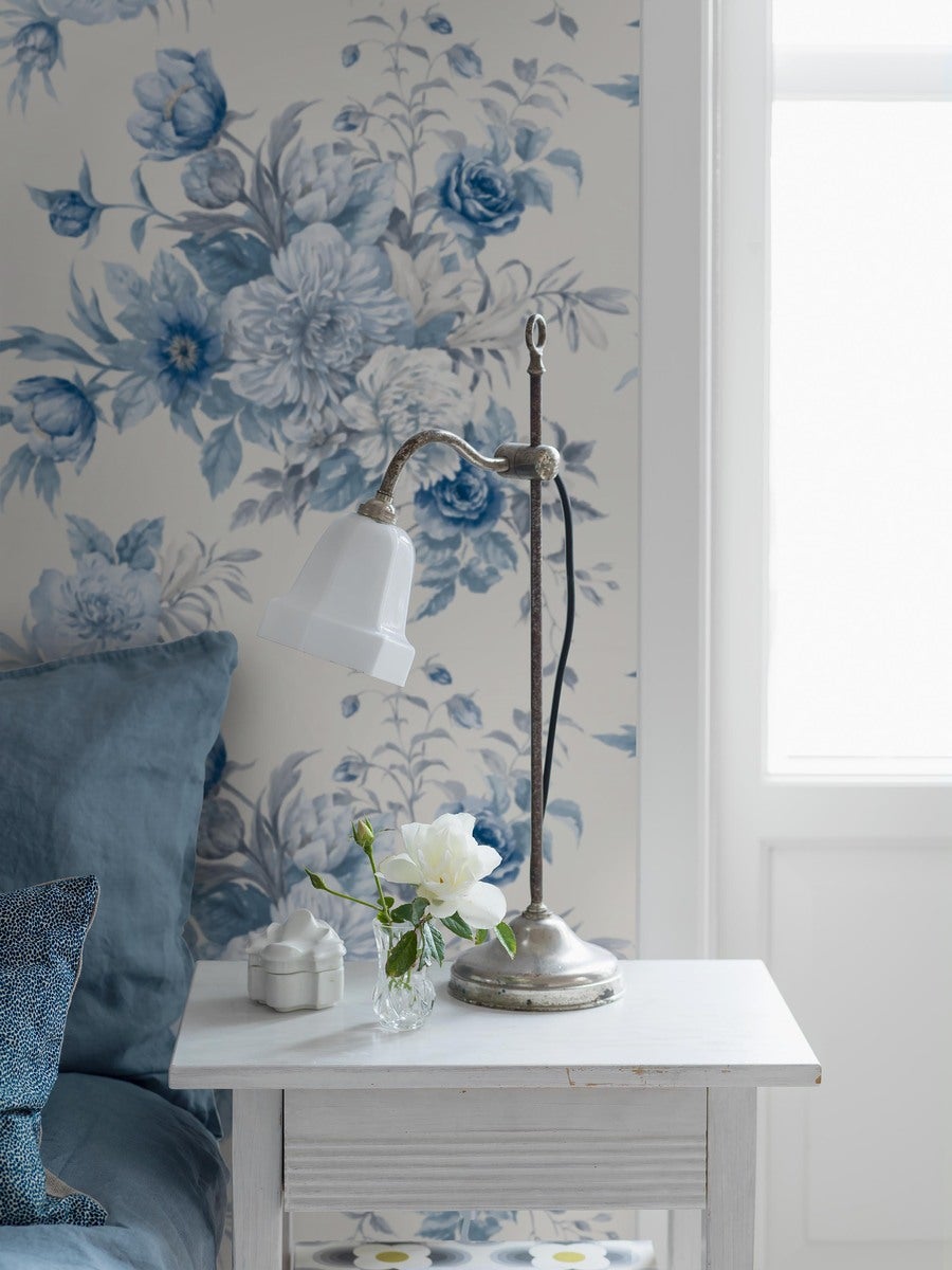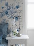 Ta tapeta, na nieskazitelnie białym tle, przedstawia niebieskie kwiaty inspirowane chińską porcelaną, w tym piwonie, lilie, zawilce i róże, które tworzą wystawne bukiety. Styl nawiązuje do elegancji porcelany z XVII...