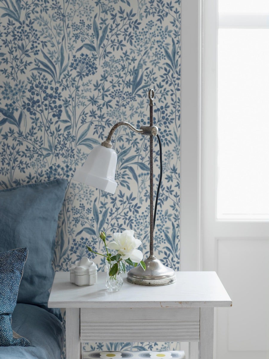 Ta tapeta Nocturne, uchwycona w klasycznej palecie błękitu i bieli, doskonale oddaje elegancję i harmonię. Gęsty wzór meandrujących liści i kwiatów Allium nawiązuje do delikatności niebiesko-białej porcelany, nadając przestrzeni wyrafinowane piękno. To doskonały wybór dla osób, które pragną wprowadzić do swojego wnętrza atmosferę spokojnej elegancji i subtelnego wdzięku.
