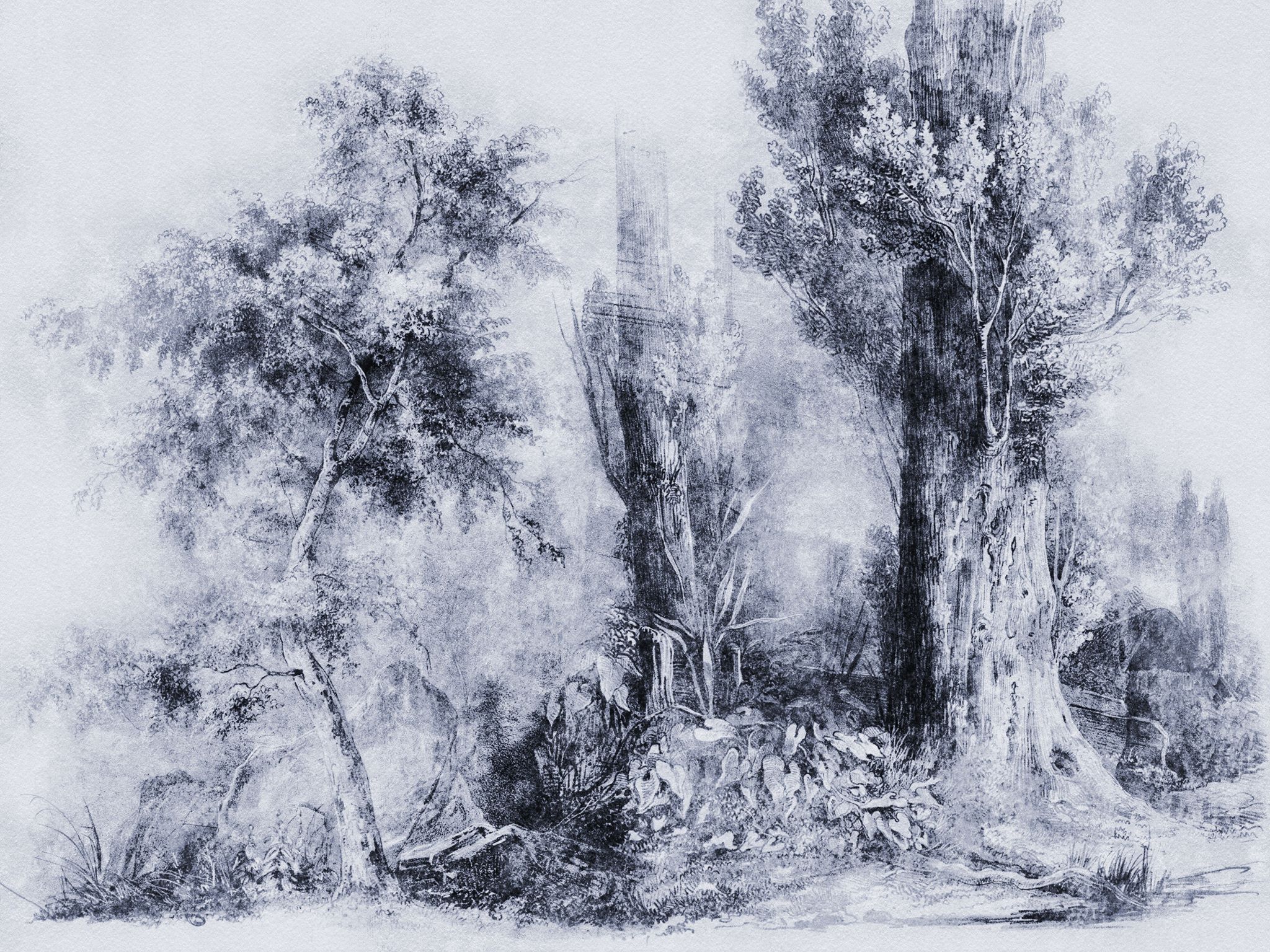 Tapeta Calm Blue to piękny mural, który przemienia ścianę w poetyczny krajobraz. Monochromatyczna paleta szarości – od niemal białych odcieni aż po głębokie grafitowe cienie – tworzy elegancką, ponadczasową kompozycję. Gęsty las naszkicowany delikatną kreską, przypominającą rysunki węglem, ma wyraźny rytm pni i konarów. Ponadto, miękkie światłocienie oraz subtelna perspektywa powietrzna dodają głębi całemu obrazowi.