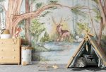Zanurz się w uspokajającą opowieść o lesie z tapetą Deer Friends. To malarska panorama, która oddaje delikatny szelest liści i szum leśnego stawu. Wśród wysokich drzew biega wiewiórka, podczas gdy majestatyczny jeleń z porożem wpatruje się w światło. Dwa małe jelonki z ciekawością zerkają na wodę. Ta scena jest harmonijna i pełna wdzięku, przypominając ilustrowaną bajkę, naturalną i nieco magiczną.