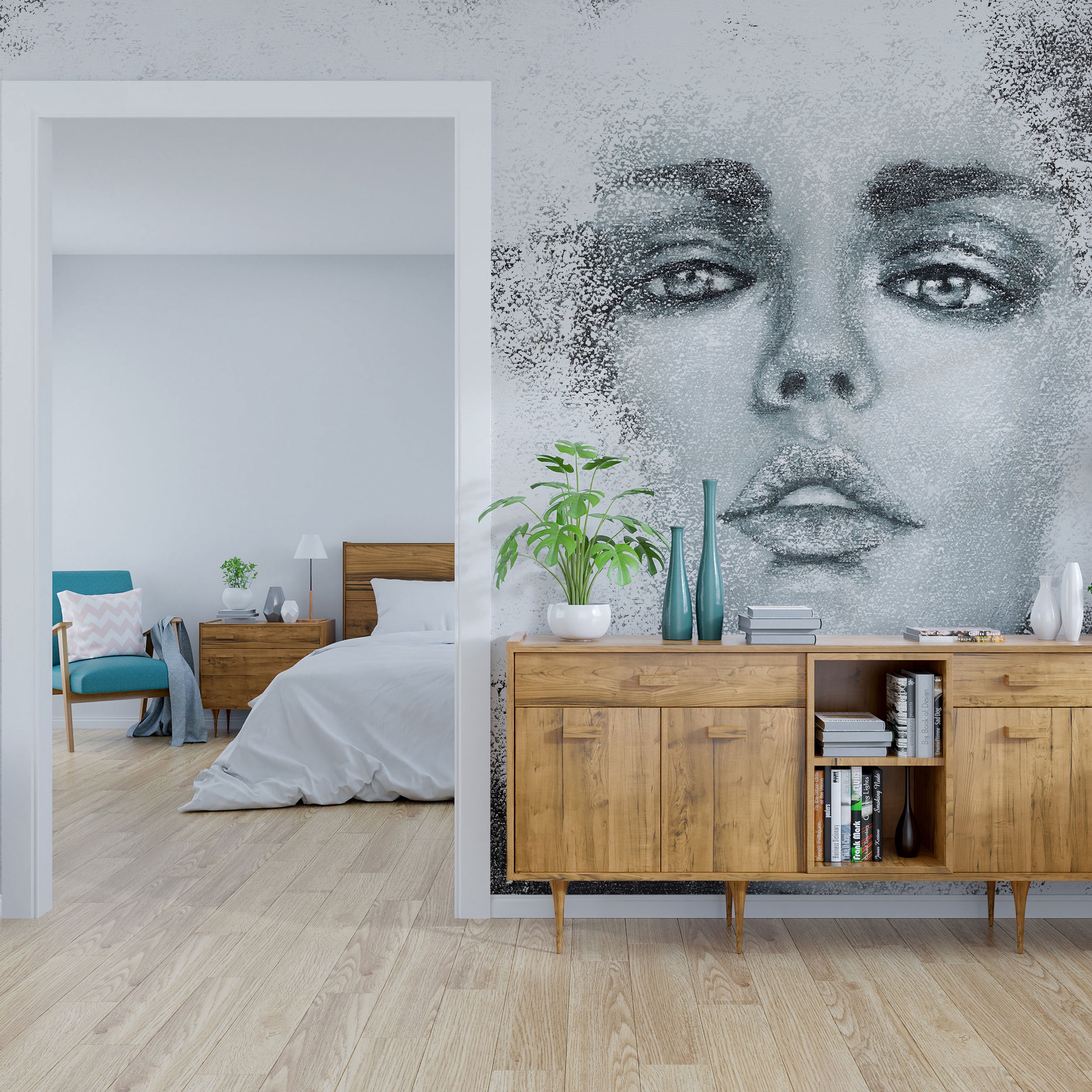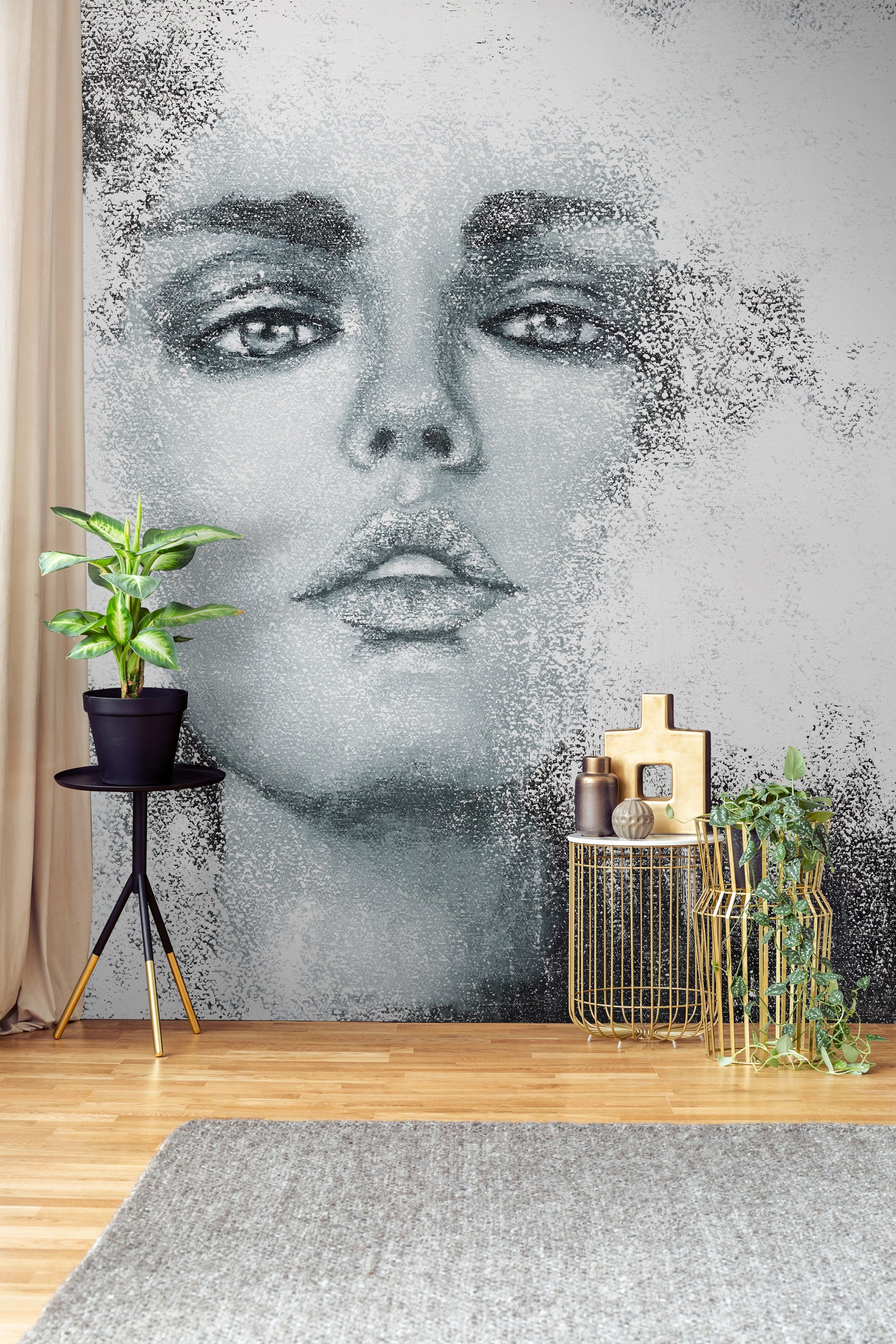 Gdy sztuka spotyka ciszę, ściana staje się sceną. Tapeta Desire to wielkoformatowy mural, który przekształca przestrzeń w prywatną galerię. Monochromatyczny portret kobiecej twarzy wyłania się z bieli i chłodnych szarości, jakby delikatnie stapiał się z tłem. To fragmentaryczna kompozycja – z czoła do ust – zbudowana z miękkich przejść tonalnych, subtelnych smug i ziarnistych „przetarć”. Tworzy głębię i przyciągający wzrok punkt skupienia.
