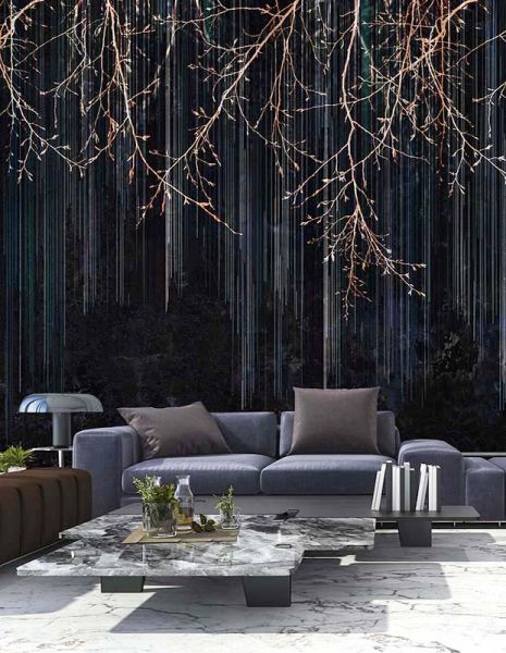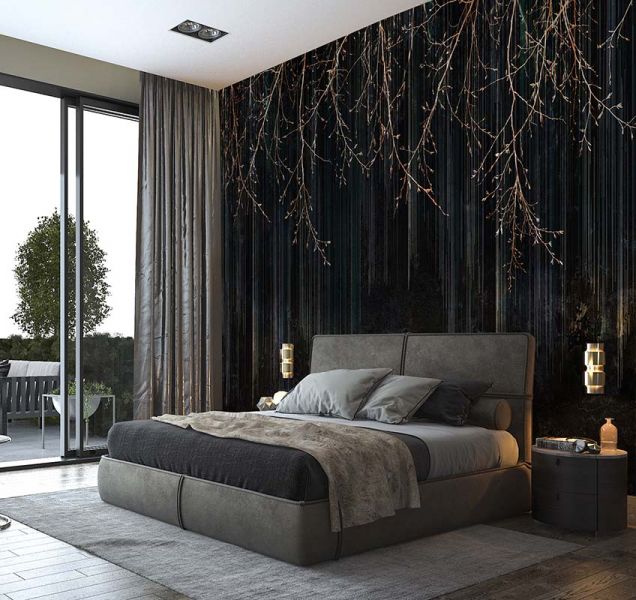 Dominujące czarne tony nadają tapecie głębię i dramatyzm. Złote, geometryczne wzory wnoszą blask i prestiżowy charakter. Abstrakcyjny wzór, przypominający stylizowane pióra lub liście, dodaje tajemniczości i egzotyki, harmonijnie łącząc się z każdym elementem przestrzeni.