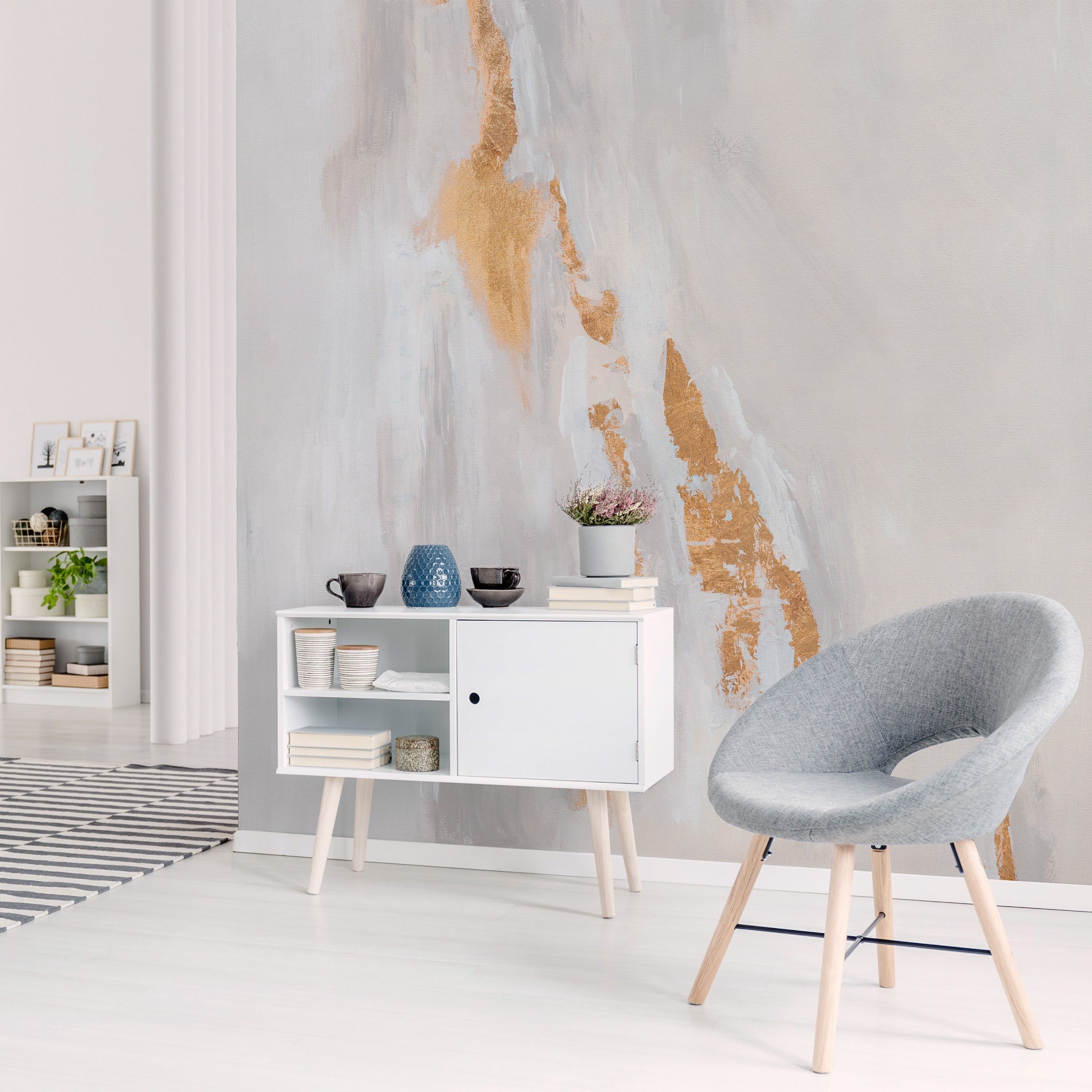 Ręcznie malowana tapeta w szarościach, bieli i delikatnym złocie; minimalistyczny muralowy motyw dodaje elegancji i głębi przestrzeni....
