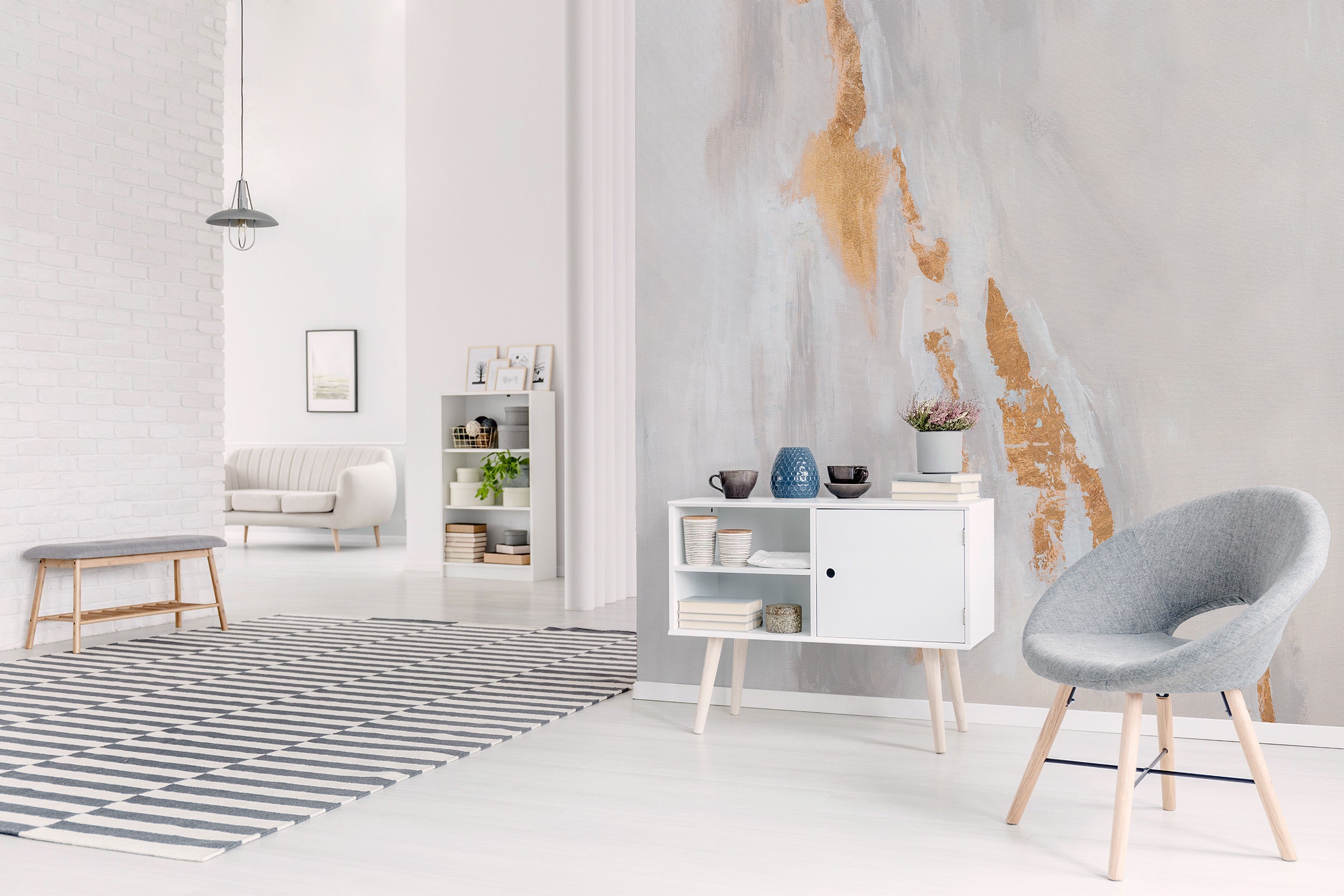 Ręcznie malowana tapeta w szarościach, bieli i delikatnym złocie; minimalistyczny muralowy motyw dodaje elegancji i głębi przestrzeni.