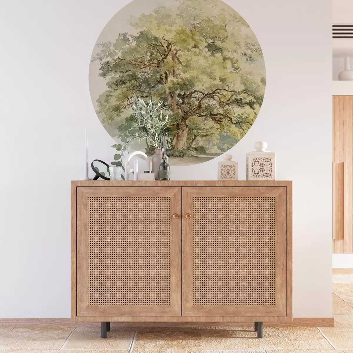 Tapeta samoprzylepna to świetny pomysł na odświeżenie dowolnej aranżacji. Dots Akwarela to tapeta okrągła o średnicy 130 cm. Dzięki swojemu rozmiarowy zajmuje zdecydowanie mniej miejsca w pomieszczeniu i jest subtelniejsza i bardziej delikatna od standardowej tapety. Wzór akwarela utrzymany jest w odcieniach zieleni z delikatnym dodatkiem brązu w postaci gałęzi i ogólnego zarysu drzewa.