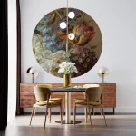 Dekoracje na ścianę w formie okrągłego muralu o średnicy 130 cm. Dekoracje ścienne Dots są wykonane z materiału samoprzylepnego o strukturze płótna ALVAR LINEN.