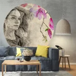 Dekoracje na ścianę w formie okrągłego muralu o średnicy 130 cm. Dekoracje ścienne Dots są wykonane z materiału samoprzylepnego o strukturze płótna ALVAR LINEN.