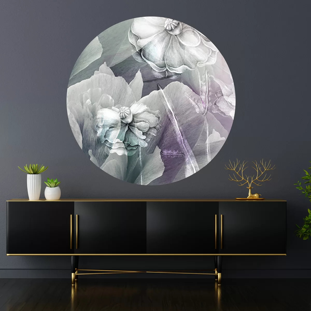Dekoracje na ścianę w formie okrągłego muralu o średnicy 130 cm. Dekoracje ścienne Dots są wykonane z materiału samoprzylepnego o strukturze płótna ALVAR LINEN.